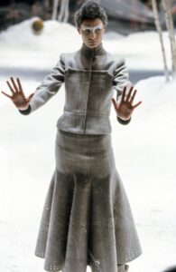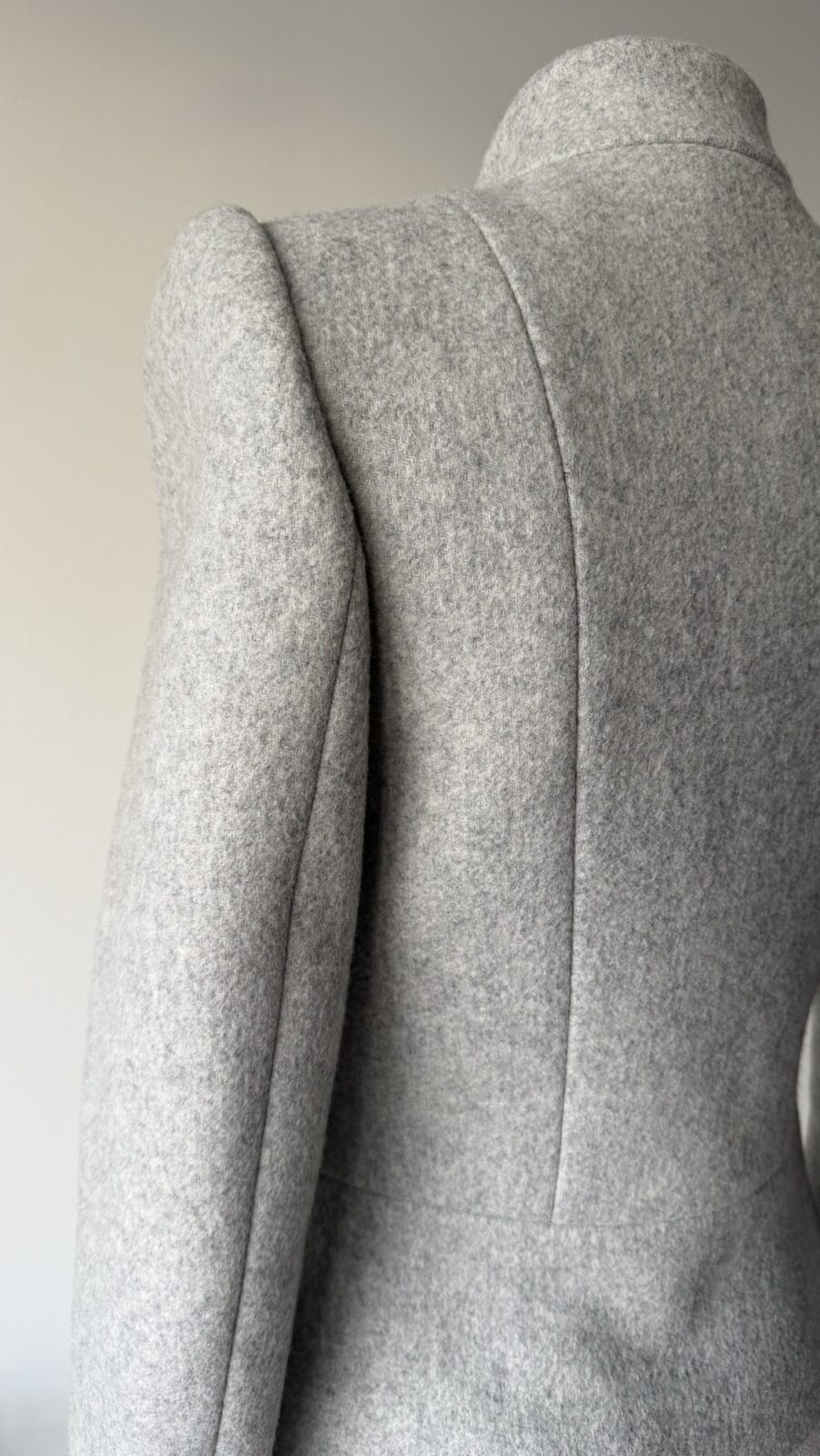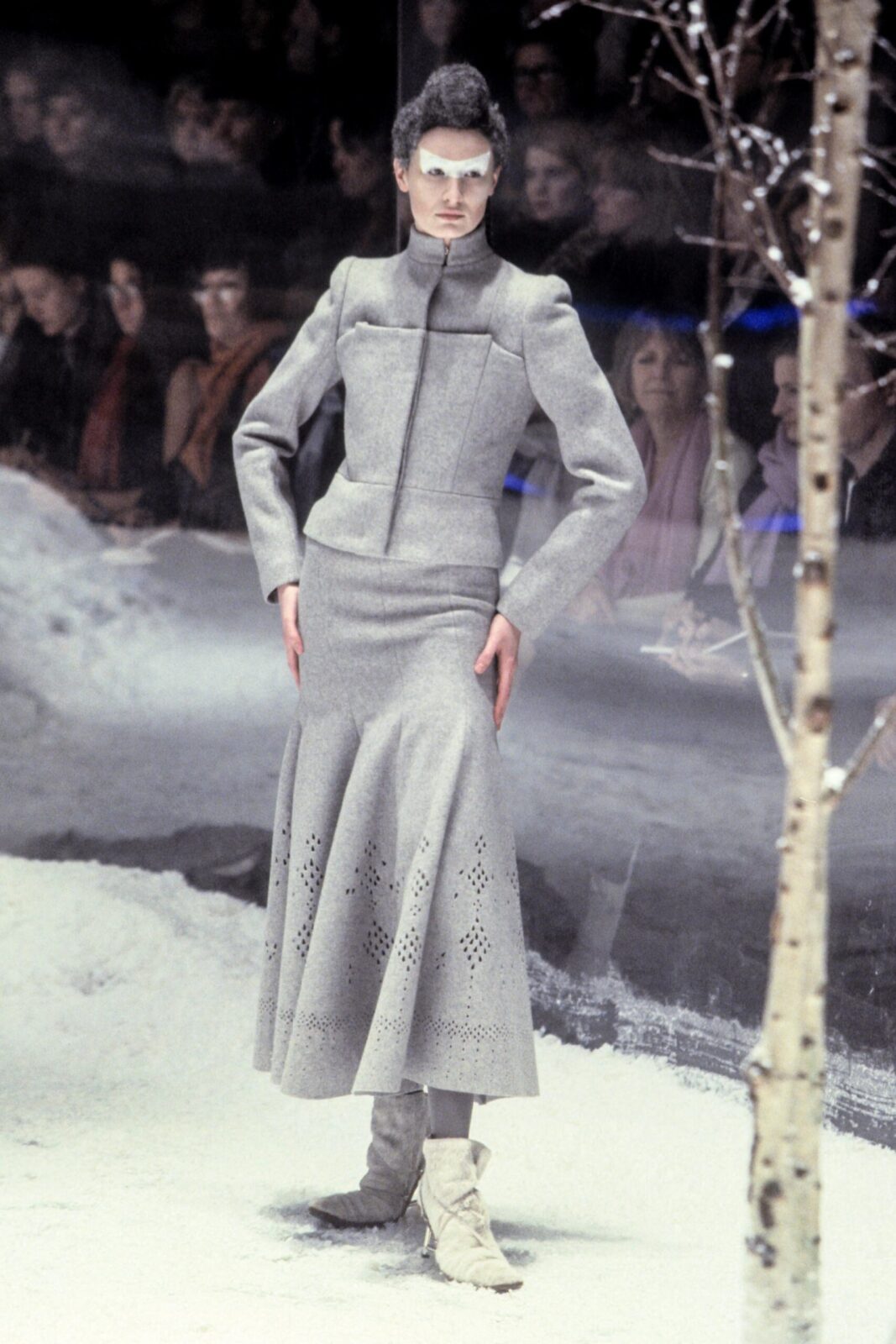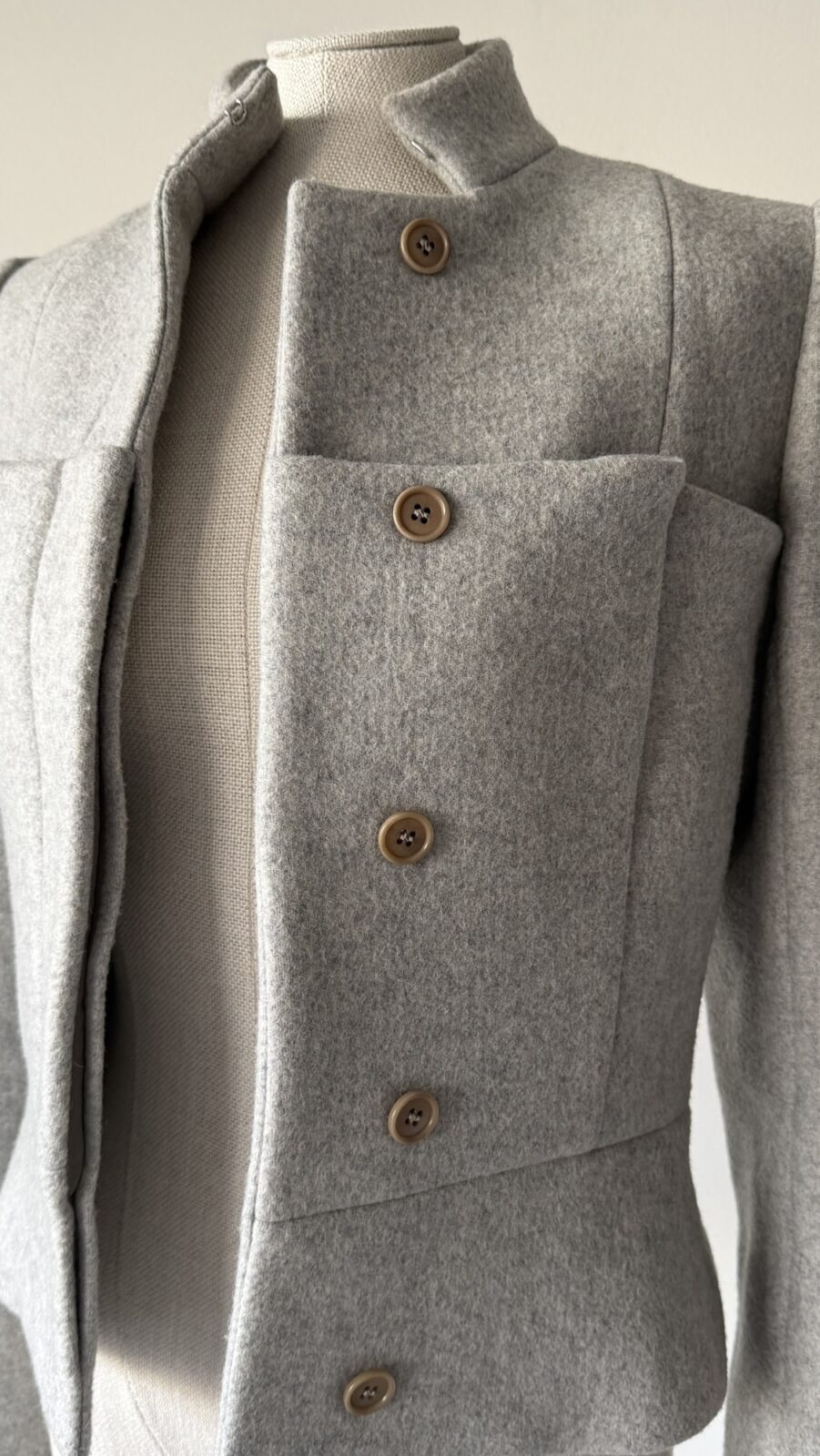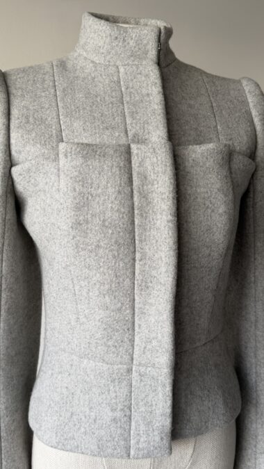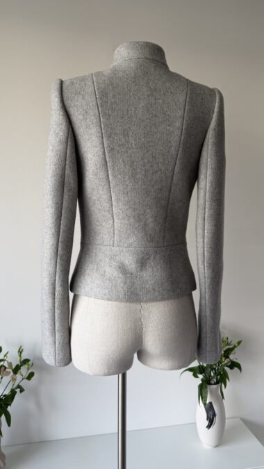 Rare Alexander McQueen soft gray wool jacket from the Fall Winter 1999 “The Overlook” collection. As seen on the runway. A true collector’s piece showcasing McQueen’s signature precision tailoring and avant-garde aesthetic.