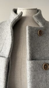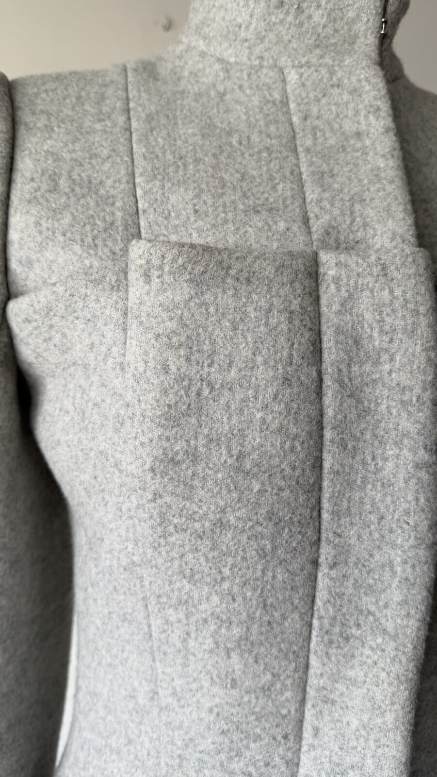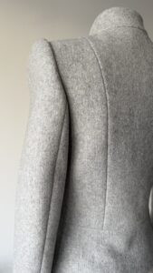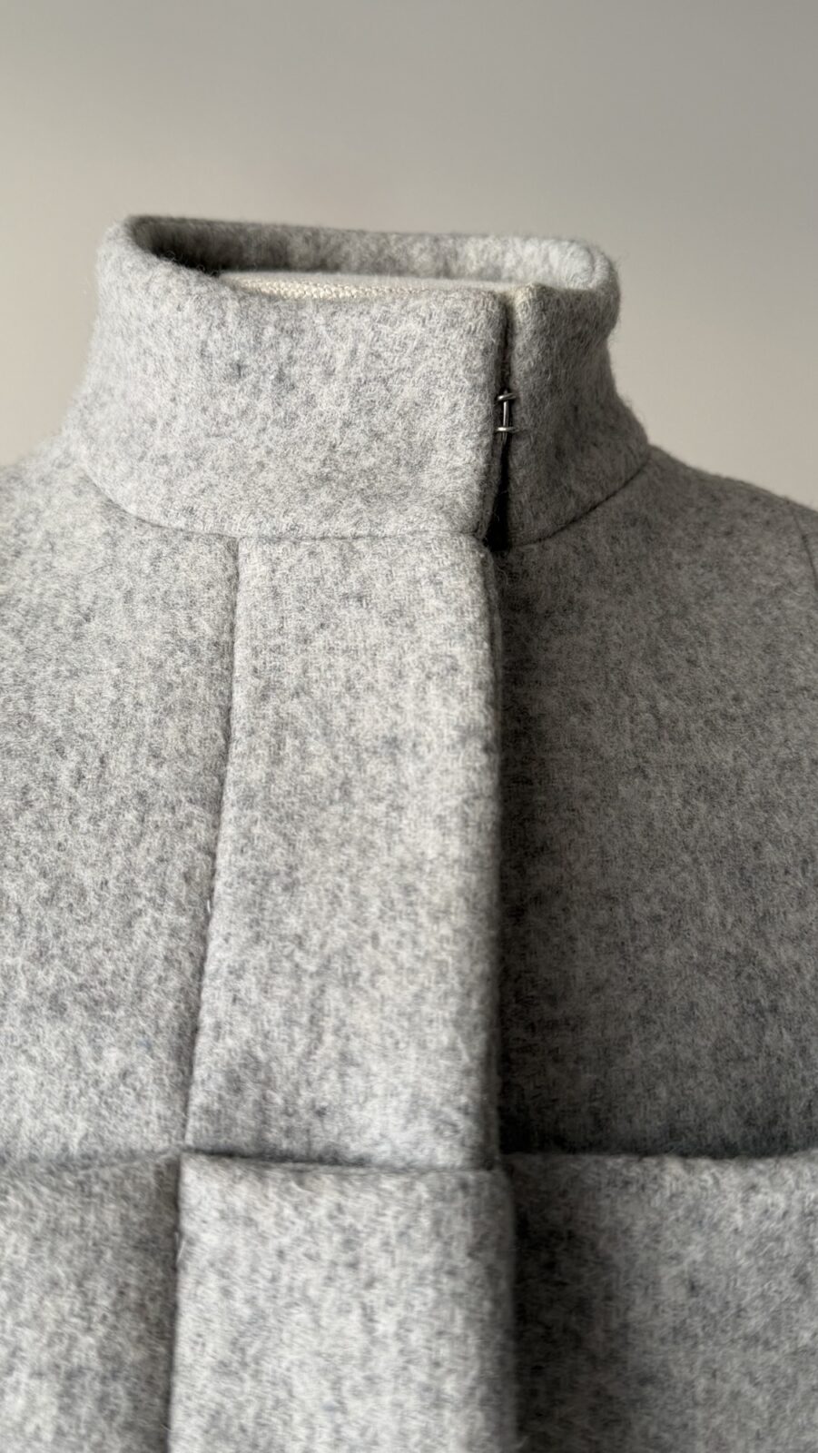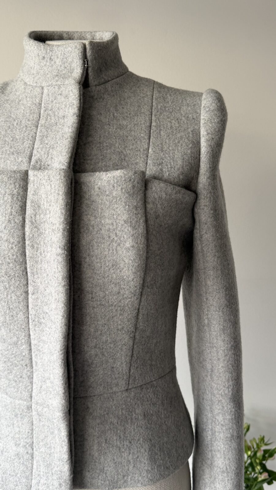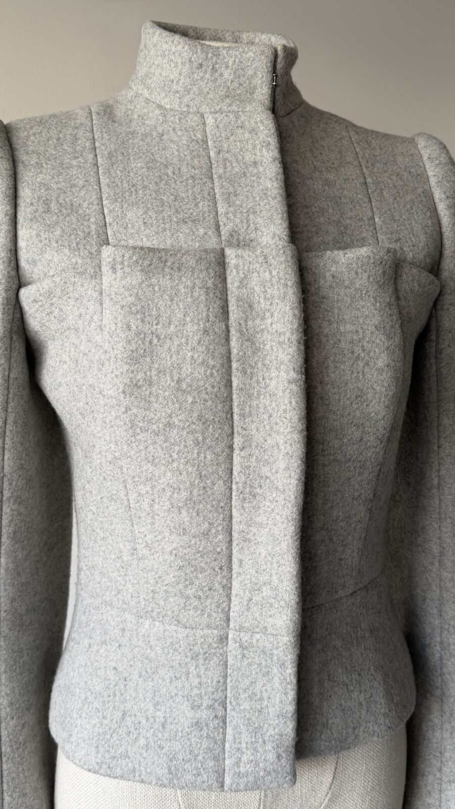 Details : This jacket features a structured silhouette with strong shoulders and a sculpted waist, creating a dramatic, technical, architectural shape. It consists of a funnel collar with a concealed hook closure, a unique paneling with exaggerated rectangular front structures that add depth and dimension. It is made of a soft yet structured wool fabric.