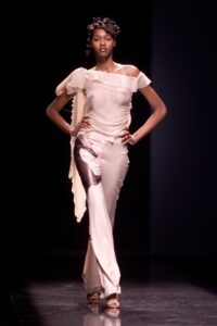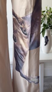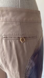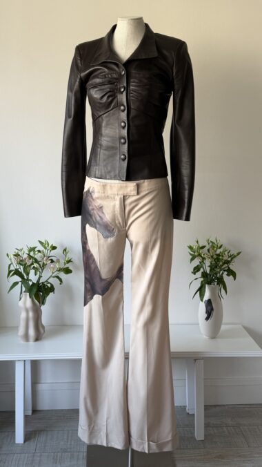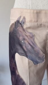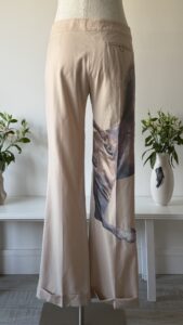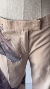 Details : This piece features a light beige colour with a horse print appliquĆ© on the right trouser that references the painting “Whistlejacket” by George Stubbs. They also have a back pocket, folded hems, a zipper, an internal clasp and an internal button for fastening.