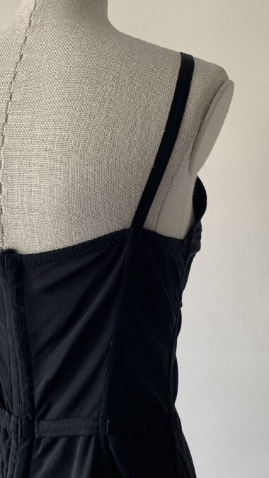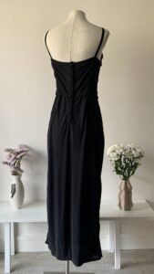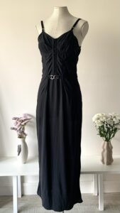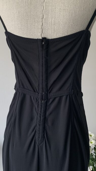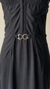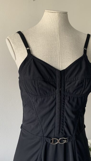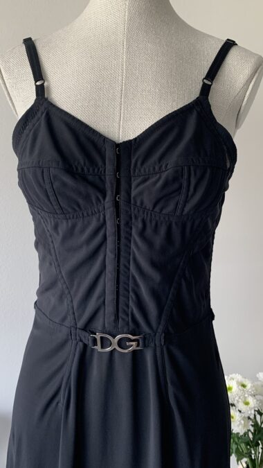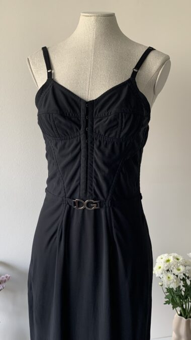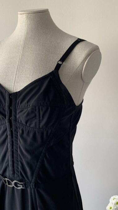 Details : This piece is of maxi length and features a corseted bust with front hook closures, black colour, a maxi skirt that hugs the body, black adjustable staps, hook fastening on the back, and a “DG” logo silver metallic detail to create the illusion of a belt. Missing the “Dolce & Gabbana” brand tag but 100% authentic.