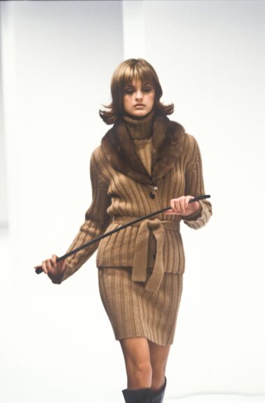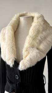 Details : This piece is finely rib‑knit in deep black wool, designed with a figure‑skimming silhouette that fastens with frontal tonal buttons and a matching self‑tie belt to emphasise the waist. The dramatic oversized fur shawl collar in plush ivory fur is a signature detail from this era of the house.
