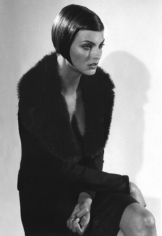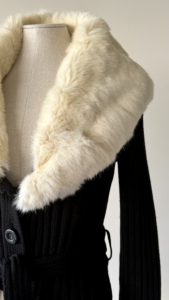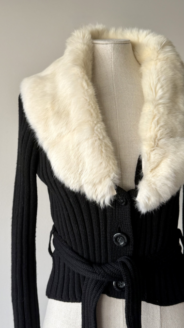 Dolce & Gabbana black wool cardigan with a dramatic white fur collar from the Fall Winter 1995 collection. As seen on the runway, in the campaign on Linda Evangelista, and in Vogue on Yasmeen Ghauri.
