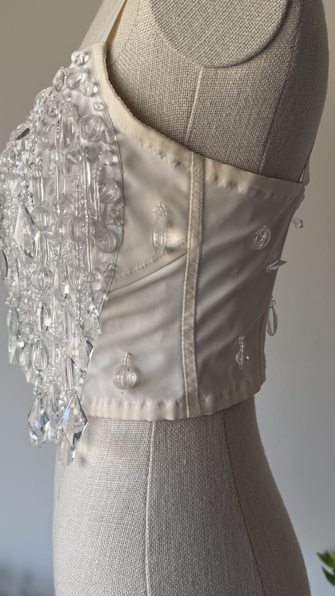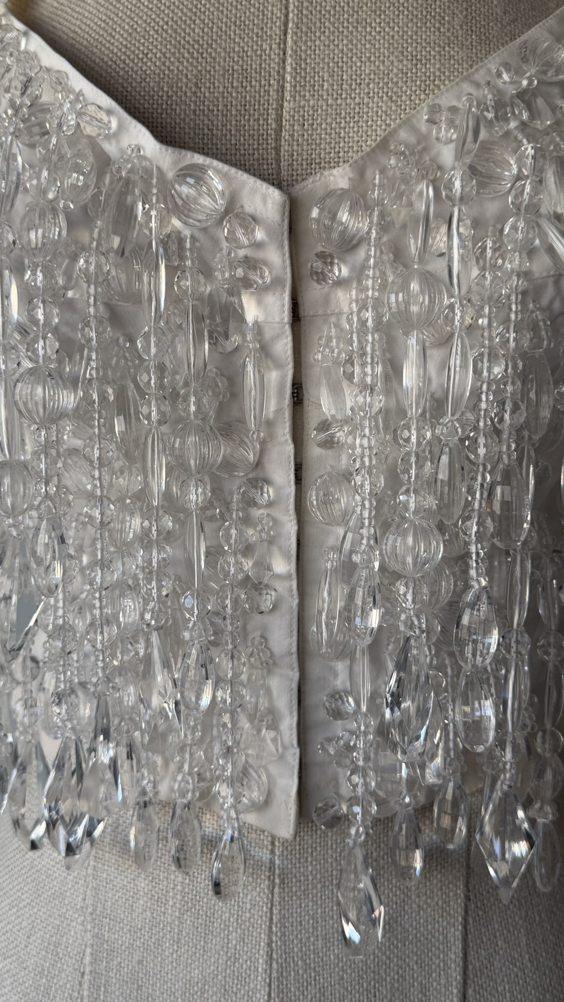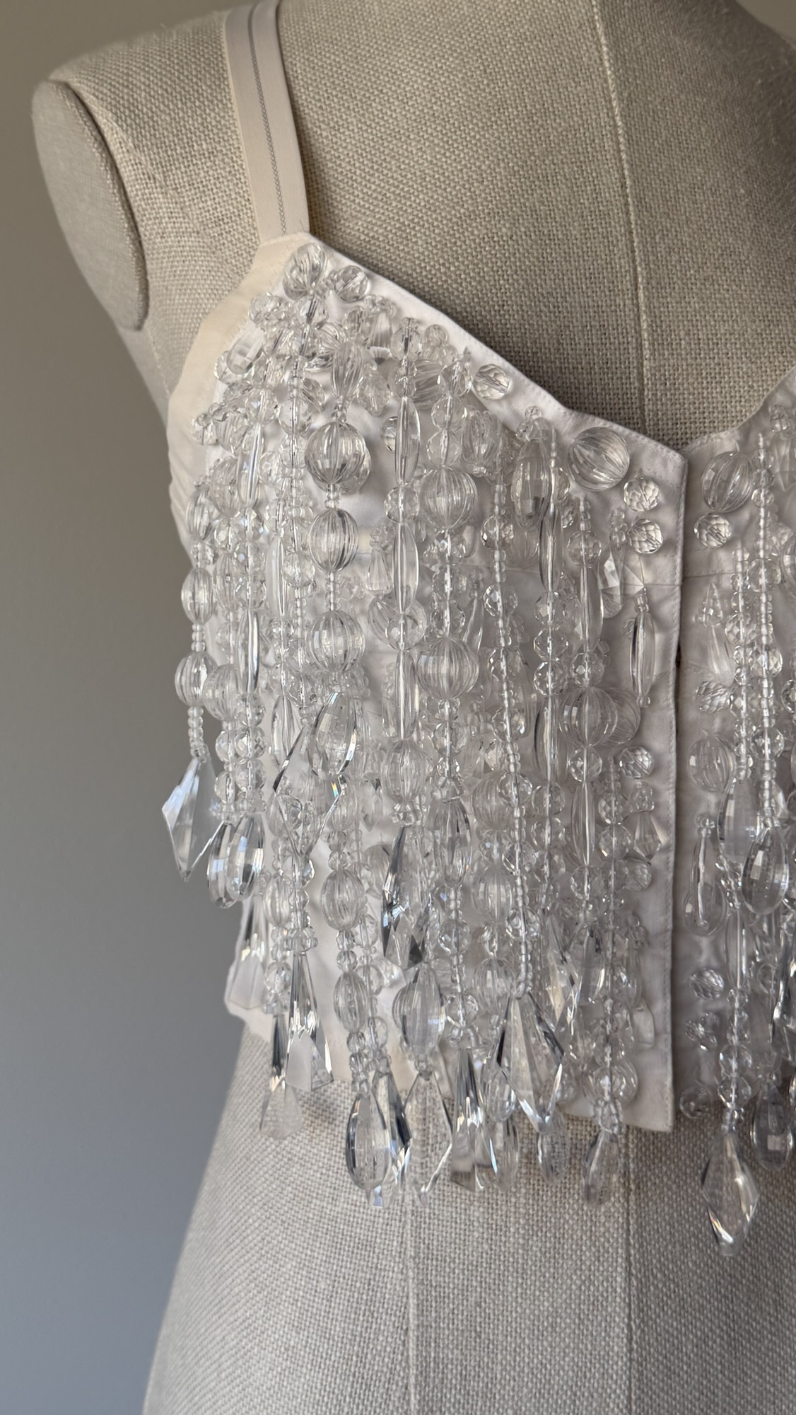 Details : This beautiful piece features a white base layered with hand-sewn cascading faceted beads and teardrop crystals, creating a liquid shimmer effect that catches movement from every angle. It has a fitted cropped silhouette, strong non adjustable straps, few crystals on the back to balance the desing and hook closures on the front. An early, heavy, couture-level piece of the brand.