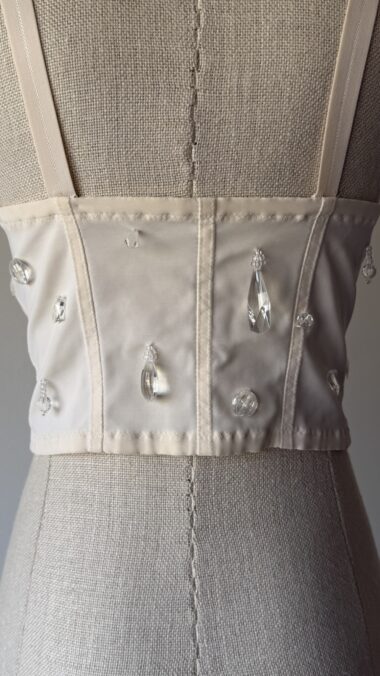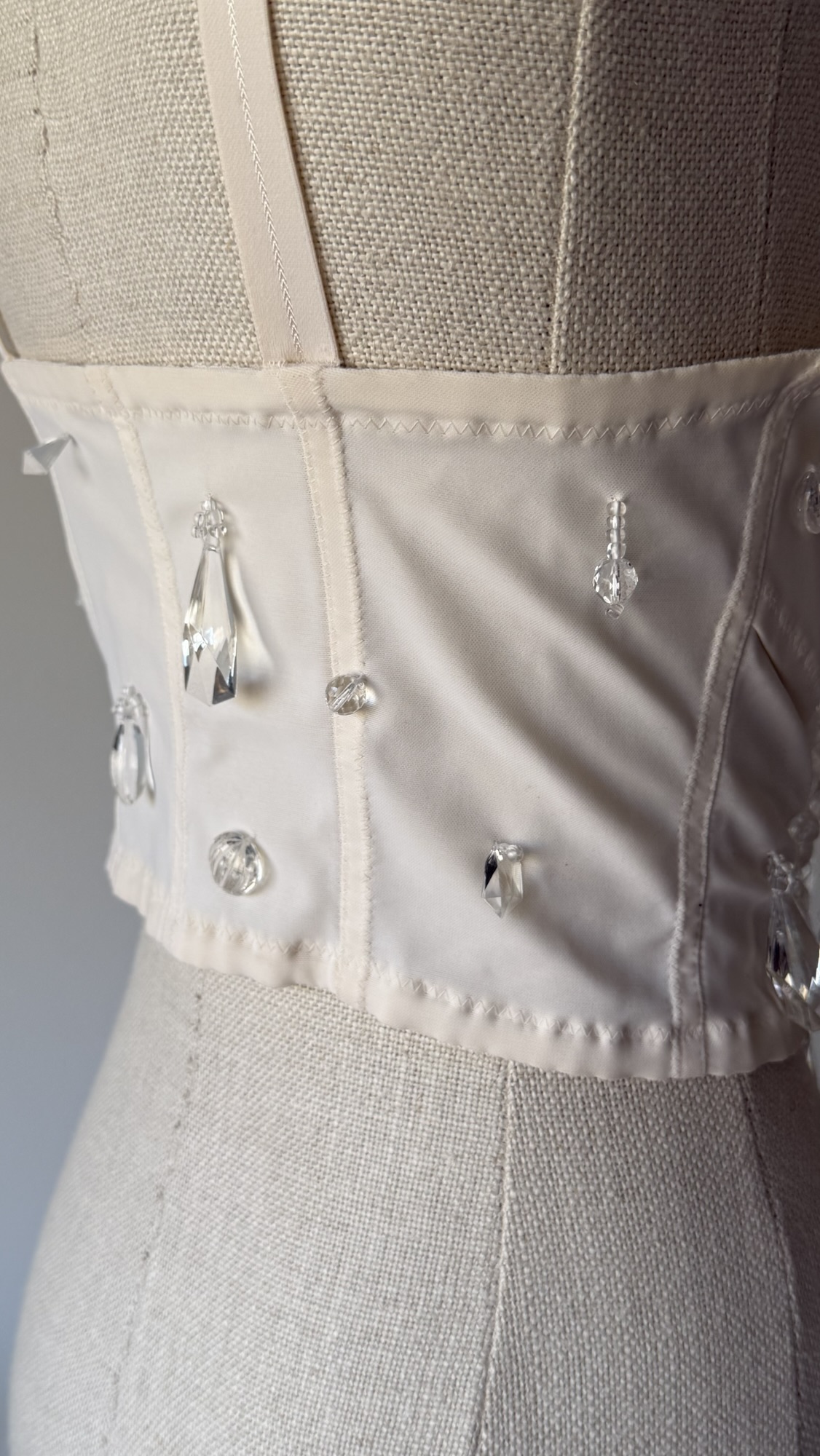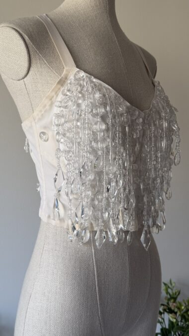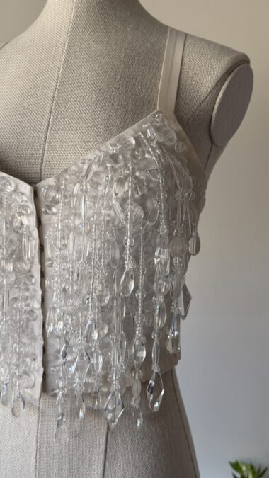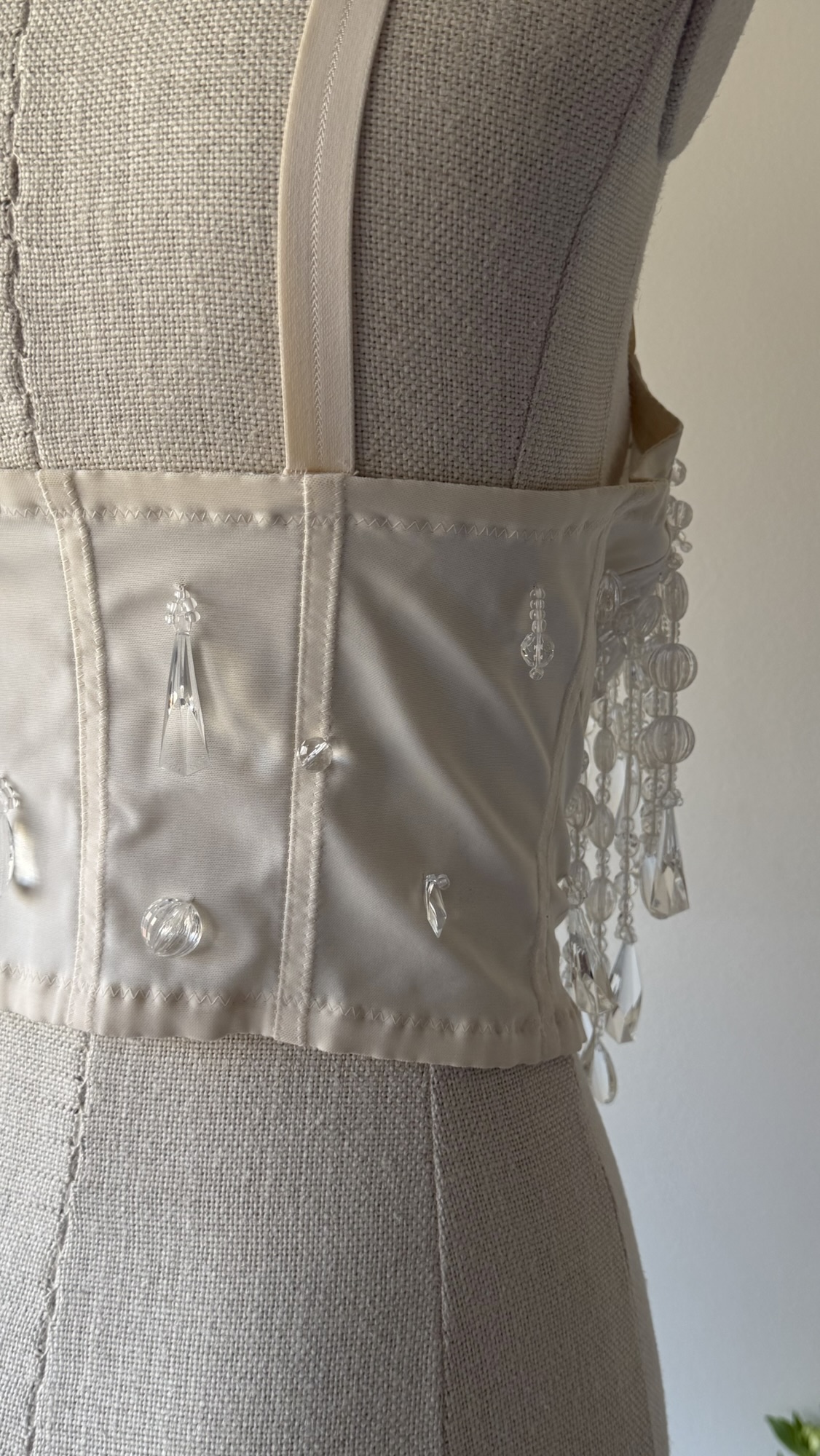 Details : This beautiful piece features a white base layered with hand-sewn cascading faceted beads and teardrop crystals, creating a liquid shimmer effect that catches movement from every angle. It has a fitted cropped silhouette, strong non adjustable straps, few crystals on the back to balance the desing and hook closures on the front. An early, heavy, couture-level piece of the brand.