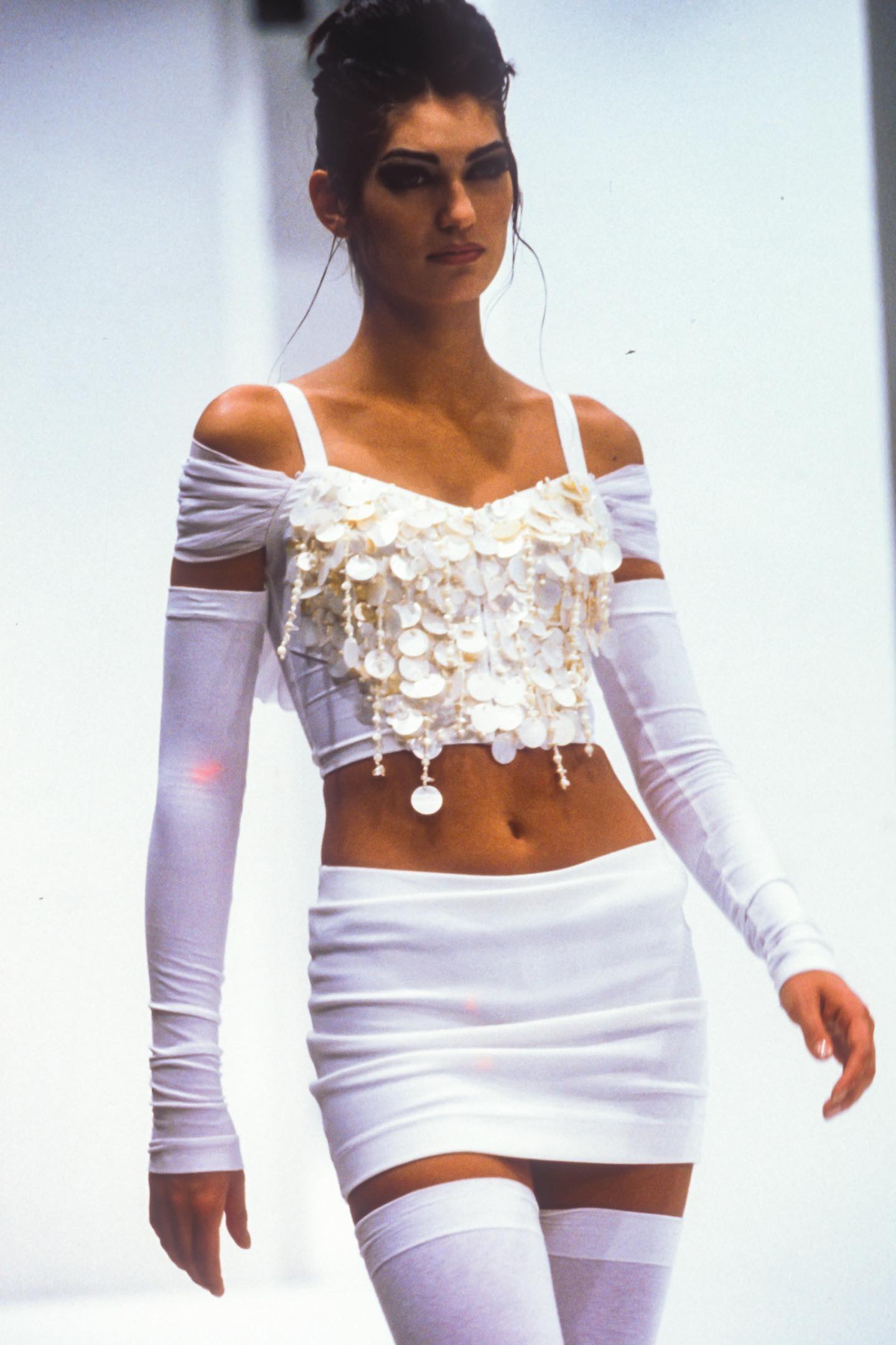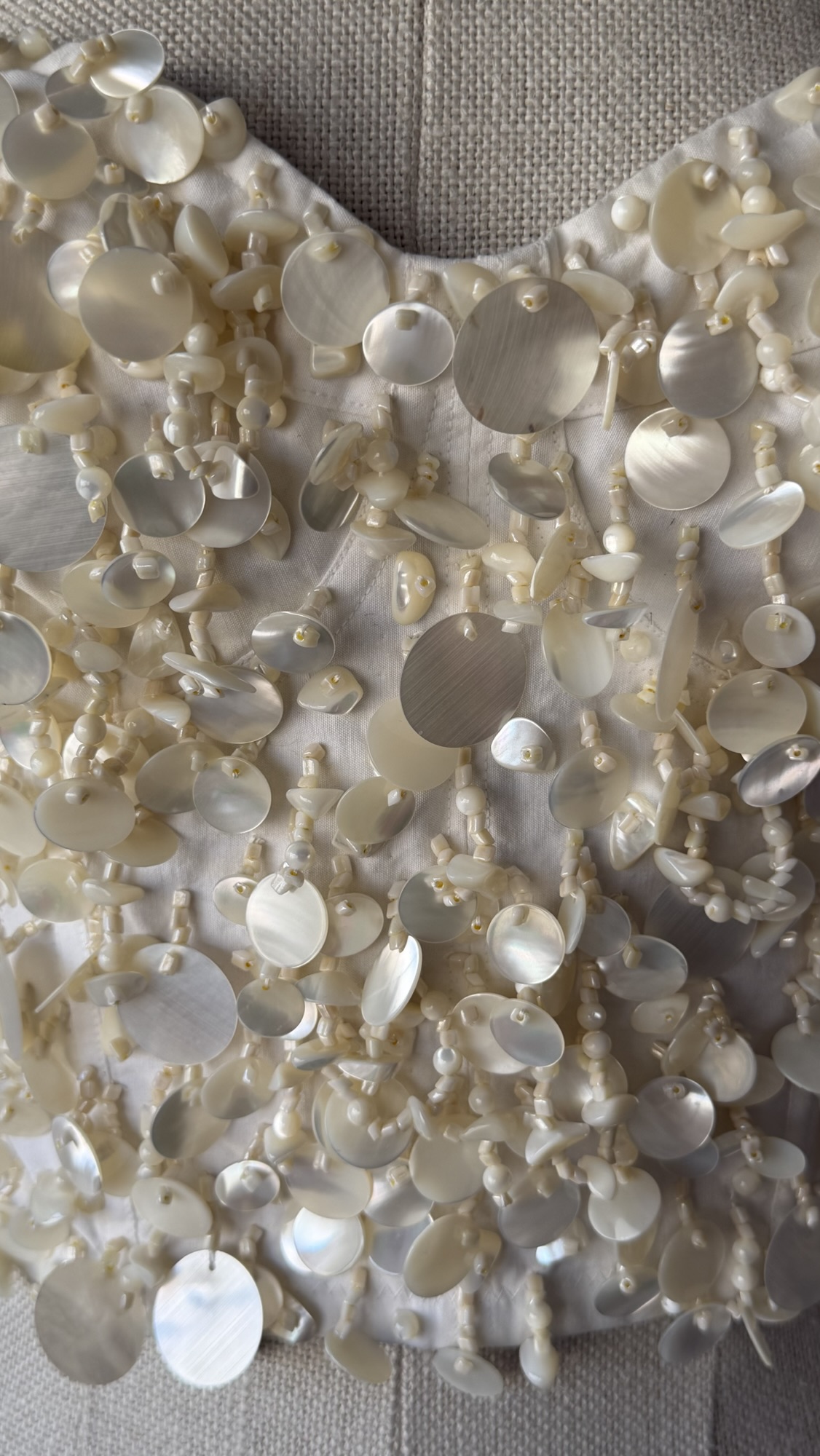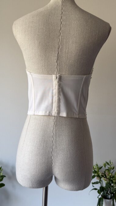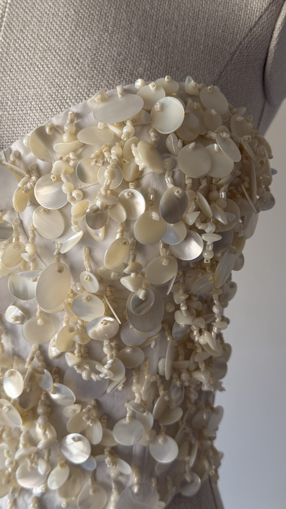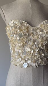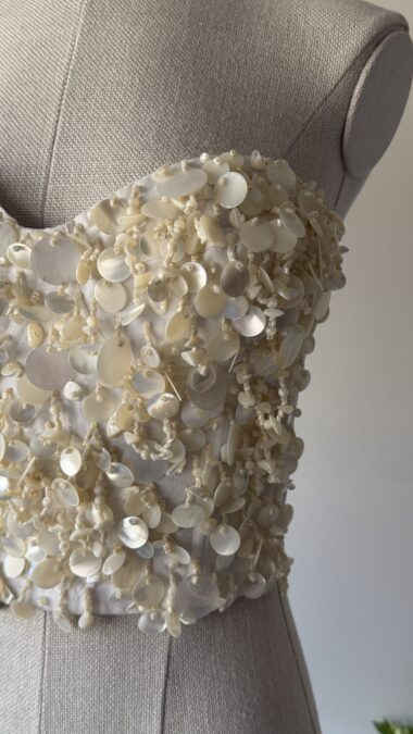 Details : This corset top features a strapless bustier and soft sweetheart design, a white colour base, heavy hand sewn seashell and mother of pearl embellishments, and a white stretchy back side with a row of hook closures. An early, couture-level piece of the brand.