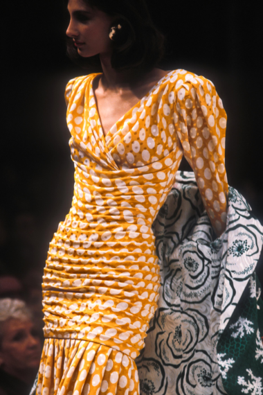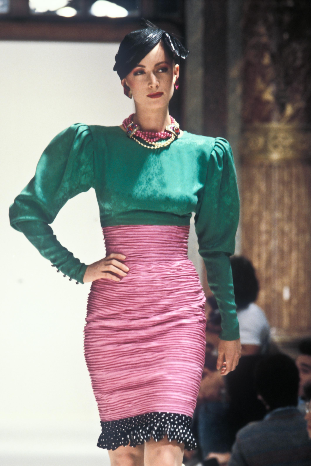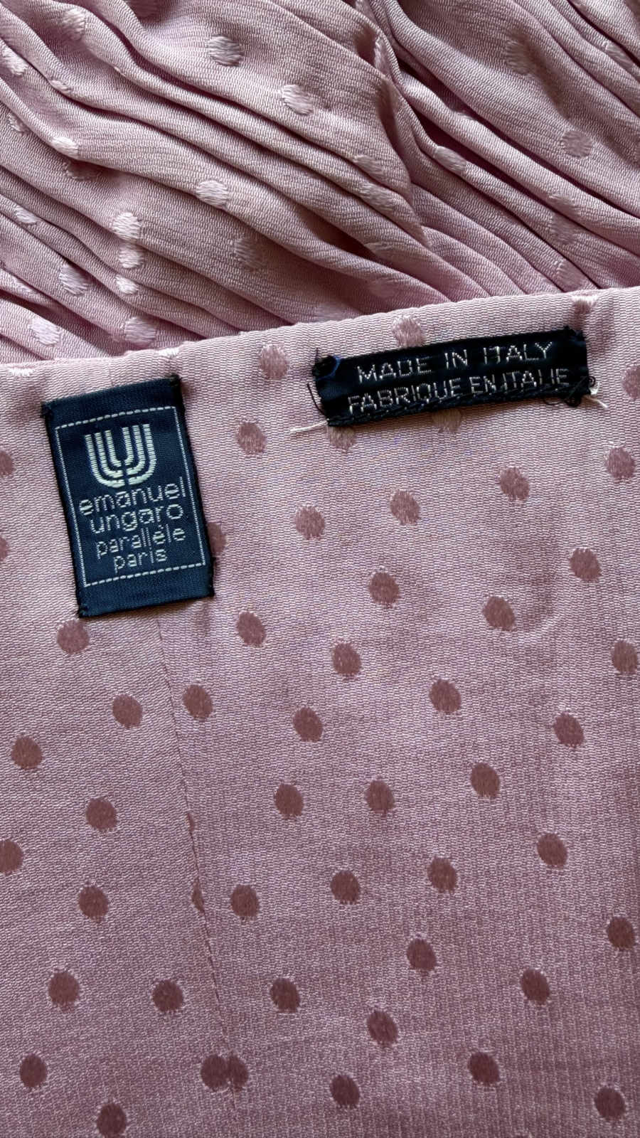 Emanuel Ungaro Parallèle (Ungaro’s prêt à porter line) soft pink polka dot pleated corset top from the Spring Summer 1986 collection. Similar seen on the runway and that year’s Couture collection.
