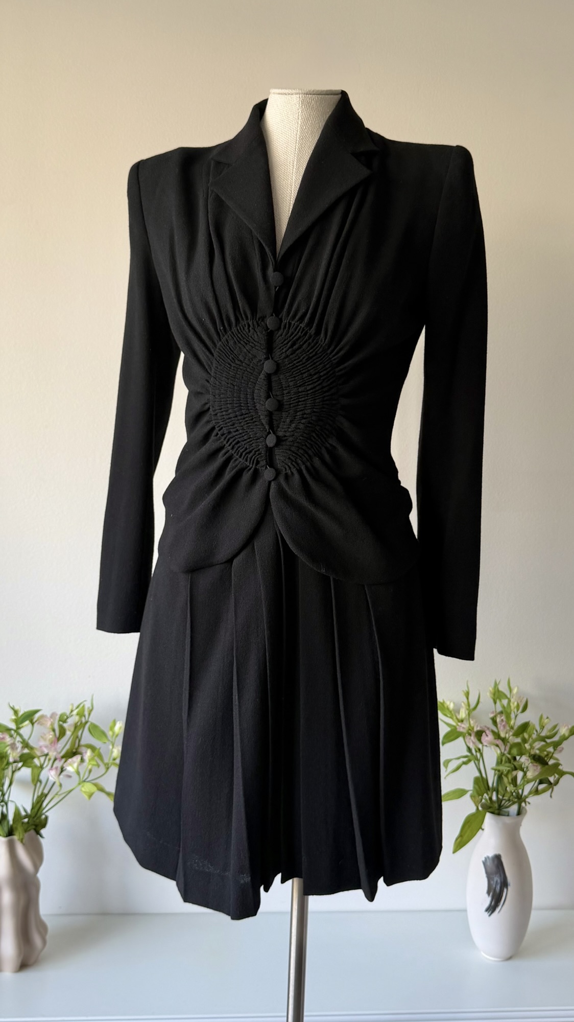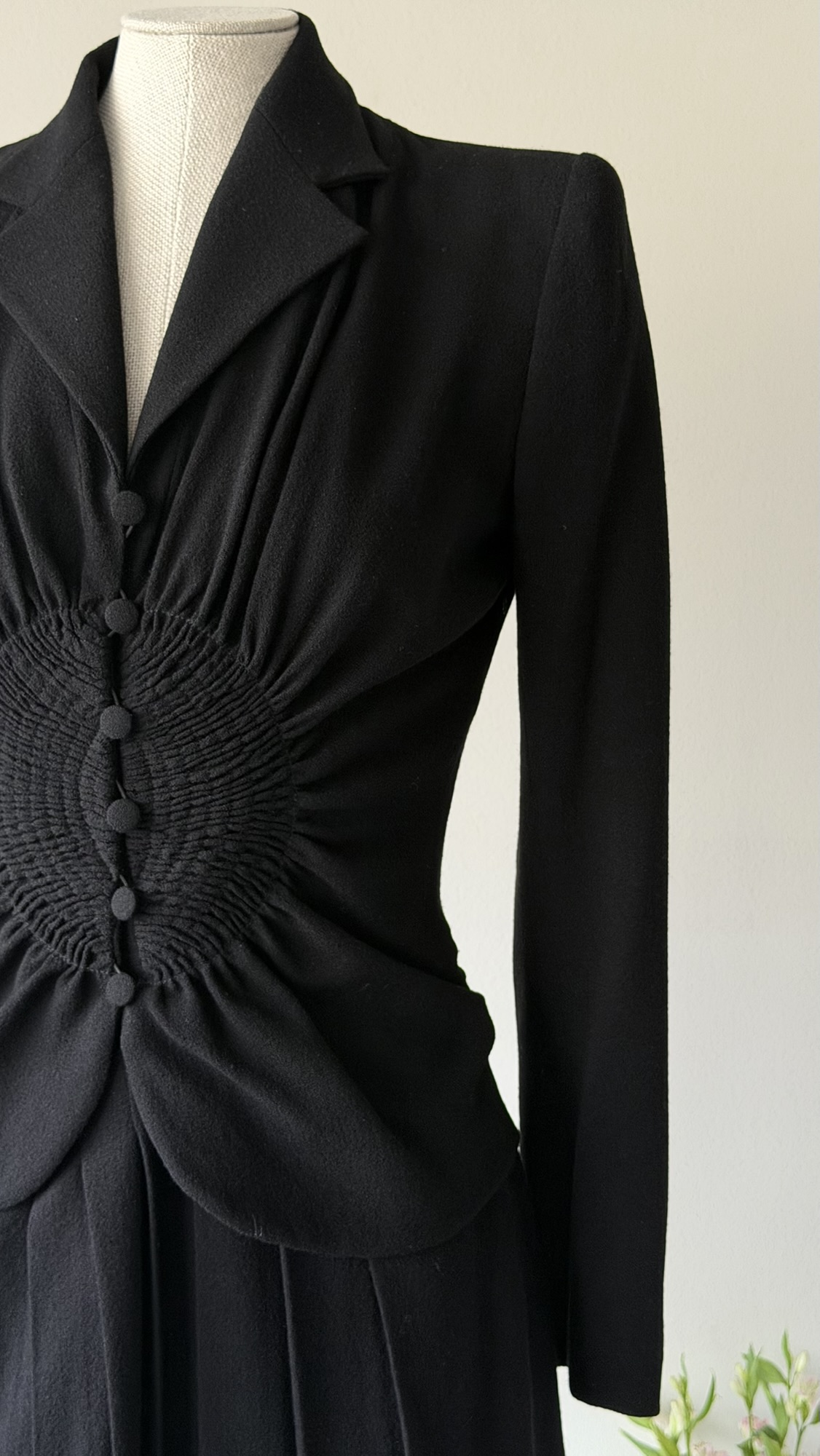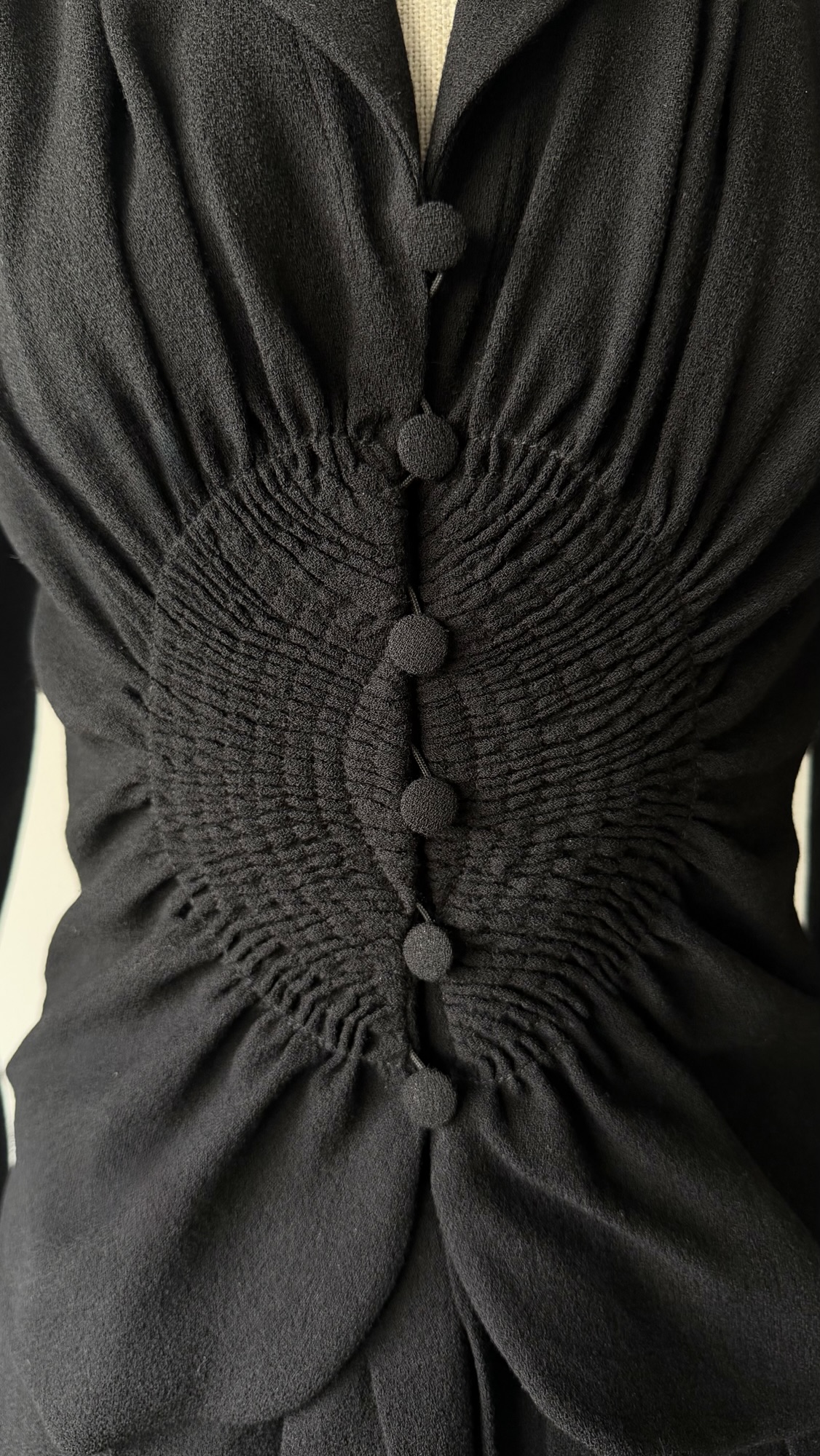 Details : This sculptural piece is crafted from a wool blend and features a sharply defined shoulder line with shoulder pads that transitions into a cinched waist, gathered through intricate smocking and accented by a row of fabric-covered buttons. The fitted bodice flows into soft pleats at the skirt.