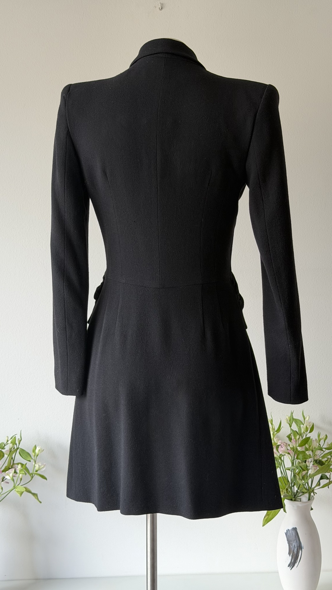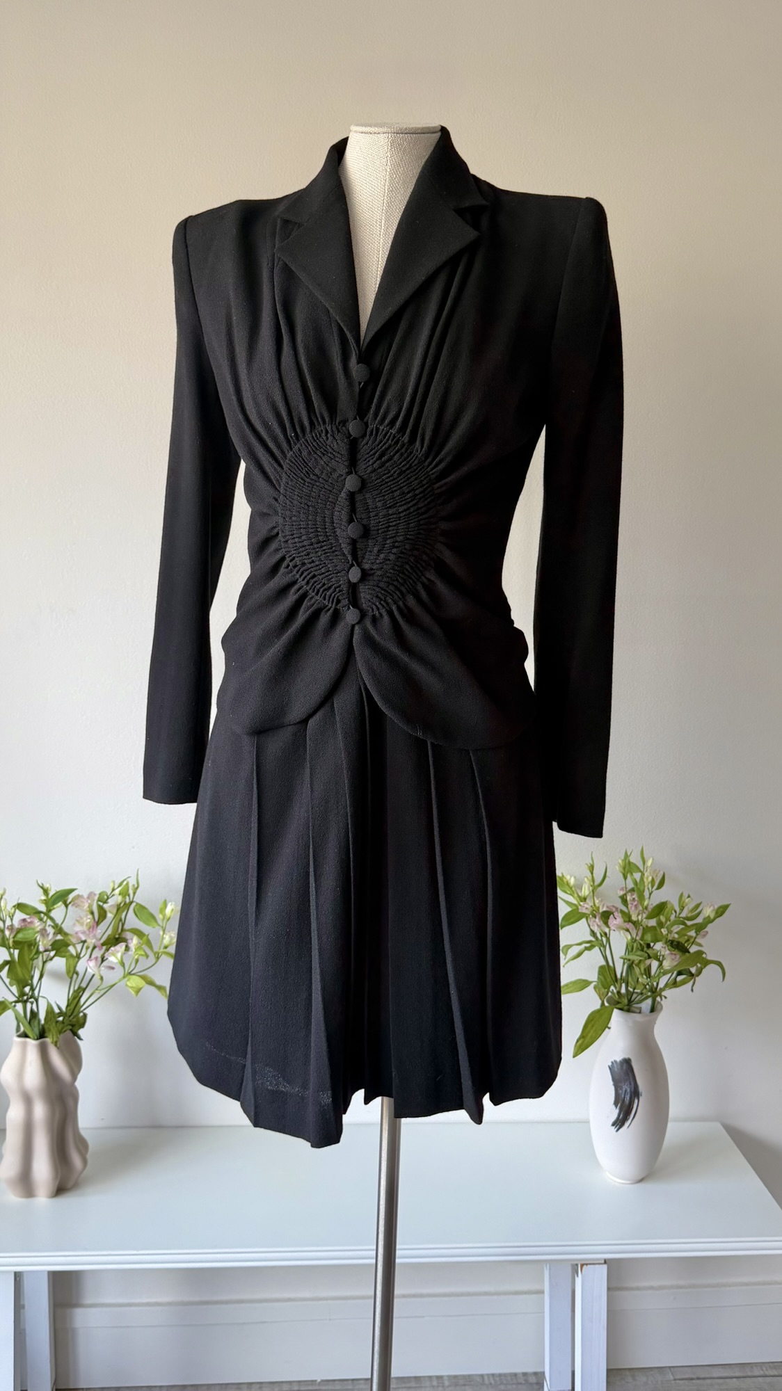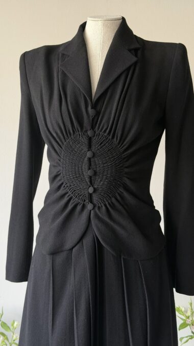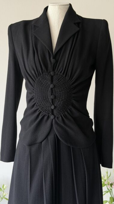 Details : This sculptural piece is crafted from a wool blend and features a sharply defined shoulder line with shoulder pads that transitions into a cinched waist, gathered through intricate smocking and accented by a row of fabric-covered buttons. The fitted bodice flows into soft pleats at the skirt.