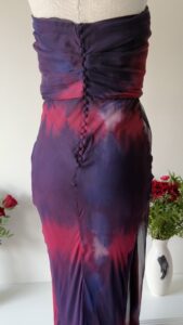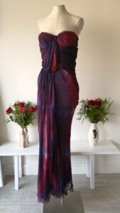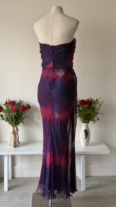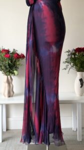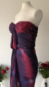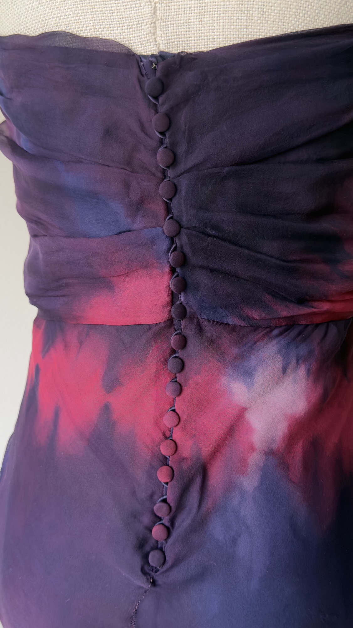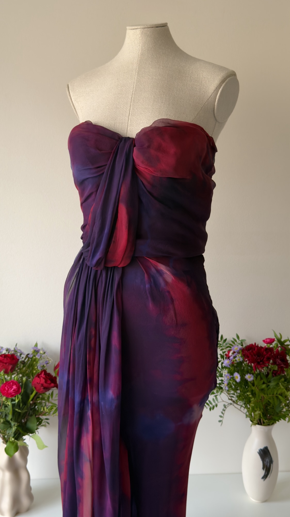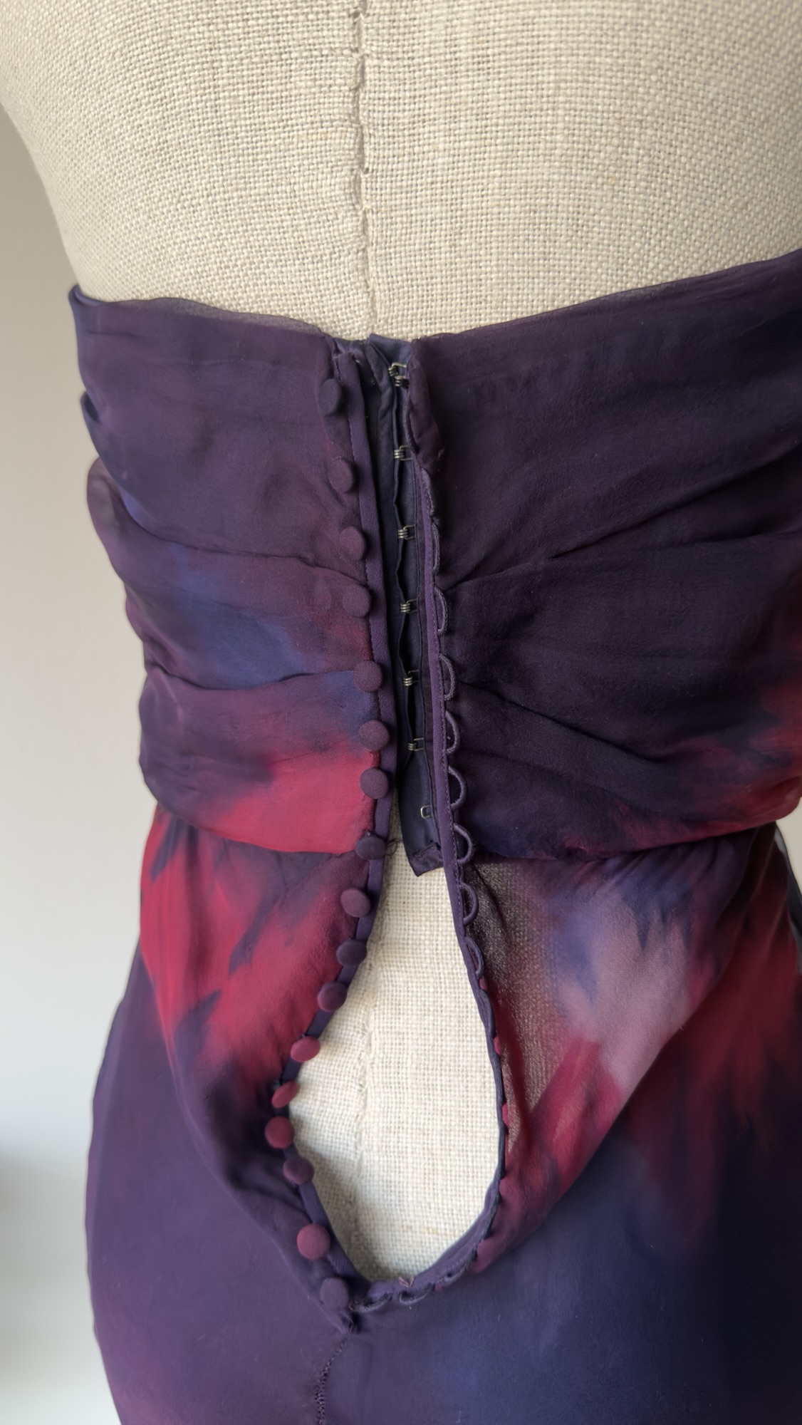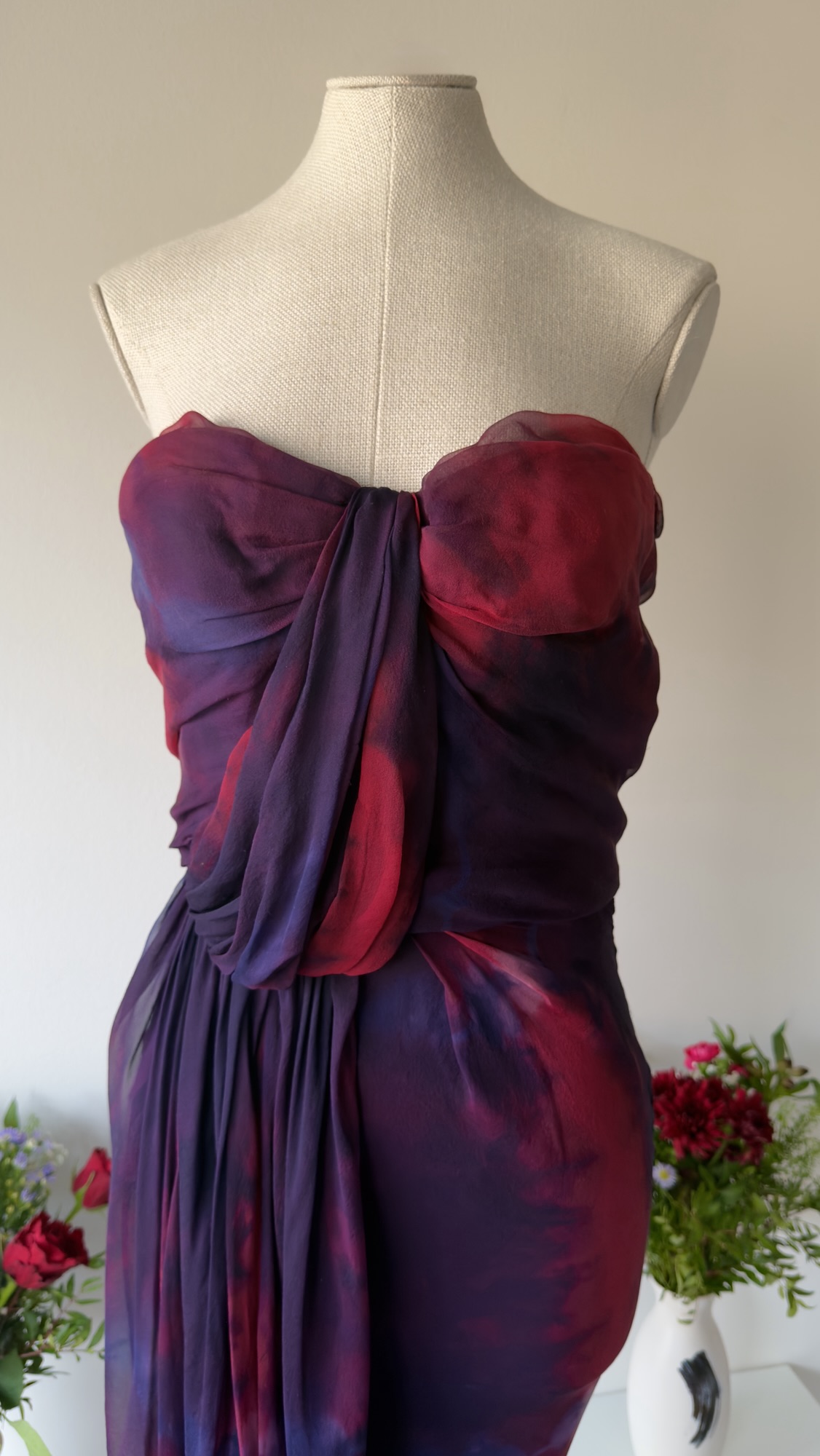 Details : This is a strapless silk chiffon flowing floor-length gown, with deep purple, wine red, and dark plum tones blended in a painterly, almost watercolor-like pattern. The bodice is strapless and softly structured with an internal bustier, with draping falling on the front. At the center front, there’s a twisted or gathered knot detail, from which fabric cascades downward. This detail draws the eye vertically and helps shape the torso. From the waist and hips, the gown falls into a long, flowing skirt that moves easily, with subtle gathers adding volume without bulk. It has the classic Galliano covered button closures, as well as hook closures on the back.
