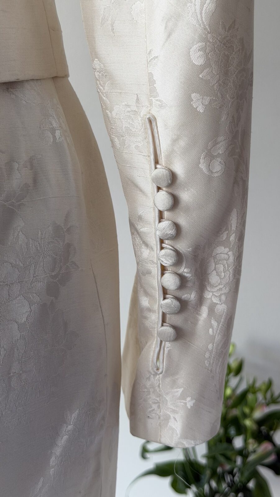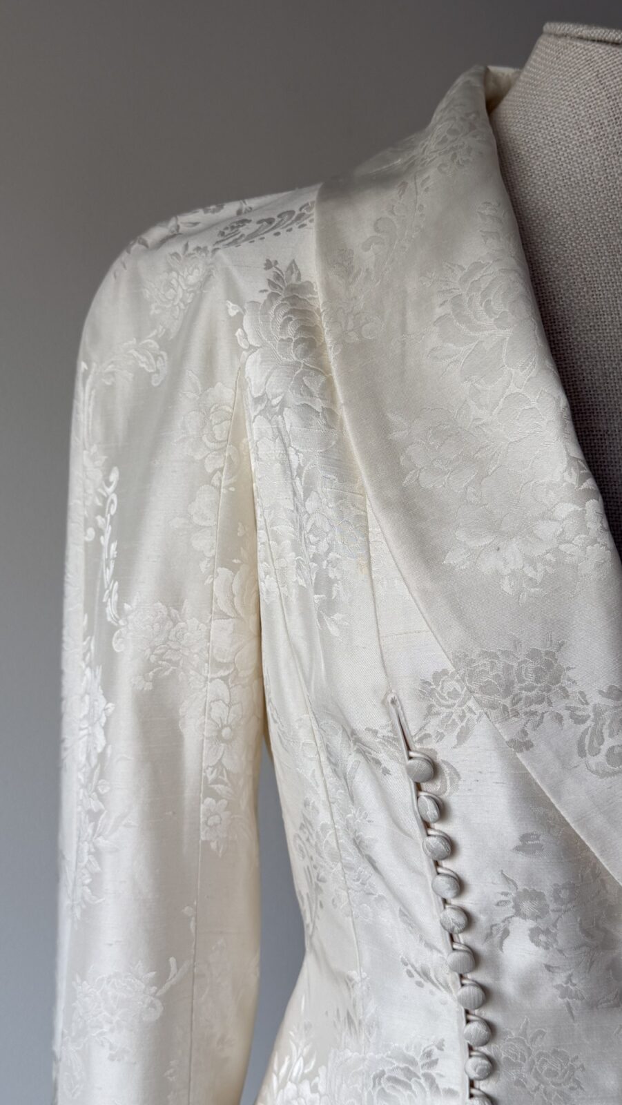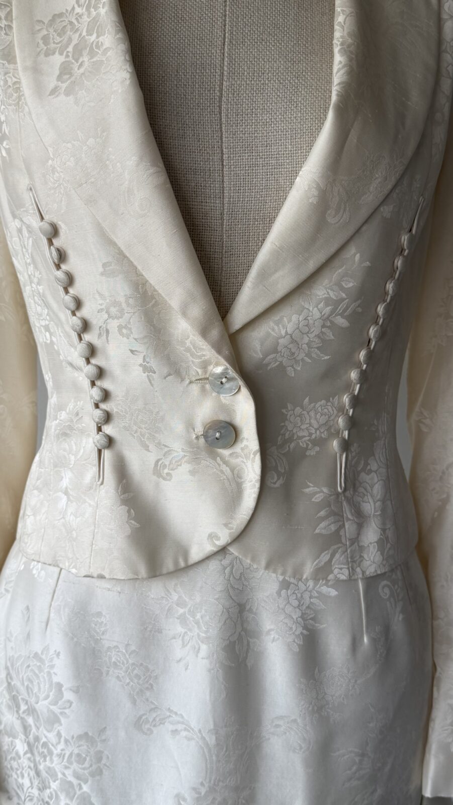 Details : This ensemble features a subtle floral jacquard pattern woven into the silk ivory fabric. The jacket is fitted with a tailored waist, has a wide shawl lapel and decorative frontal lateral buttons arranged in a double-breasted illusion. It has long and fitted with slightly puffed shoulders sleeves, and princess seams and precise darting to enhance the fit. It closes with two iridescent button closures. The skirt is knee-length, pencil style, high waisted, finished with a beautiful white lace trim.
