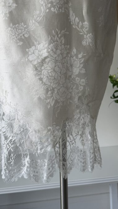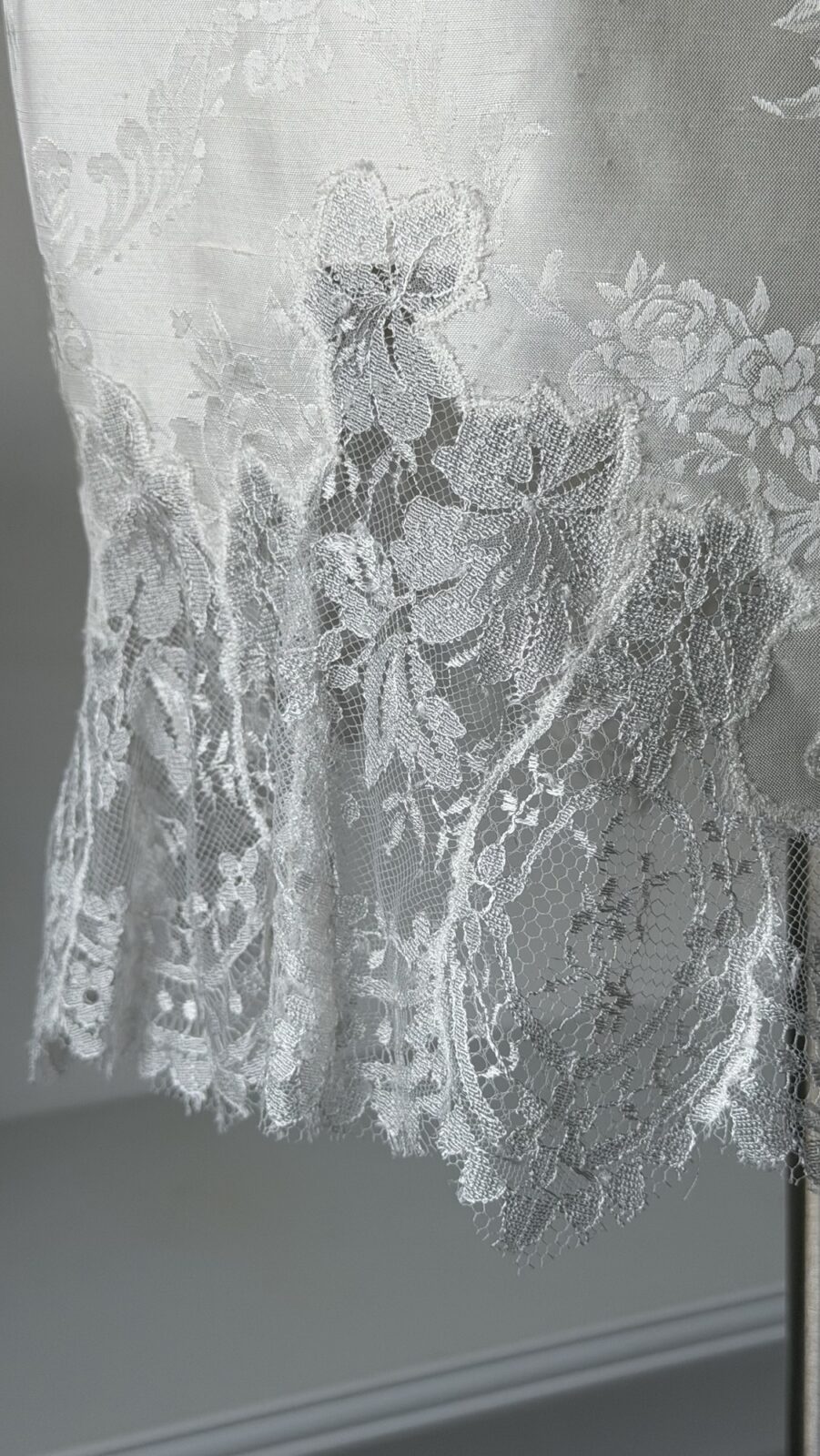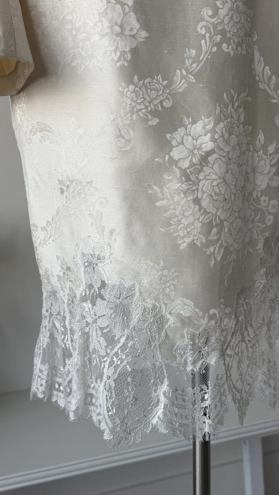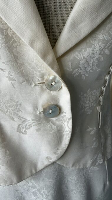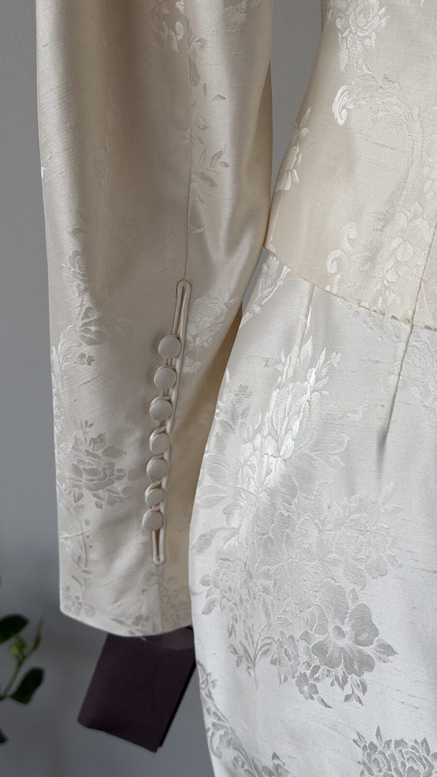 Details : This ensemble features a subtle floral jacquard pattern woven into the silk ivory fabric. The jacket is fitted with a tailored waist, has a wide shawl lapel and decorative frontal lateral buttons arranged in a double-breasted illusion. It has long and fitted with slightly puffed shoulders sleeves, and princess seams and precise darting to enhance the fit. It closes with two iridescent button closures. The skirt is knee-length, pencil style, high waisted, finished with a beautiful white lace trim.