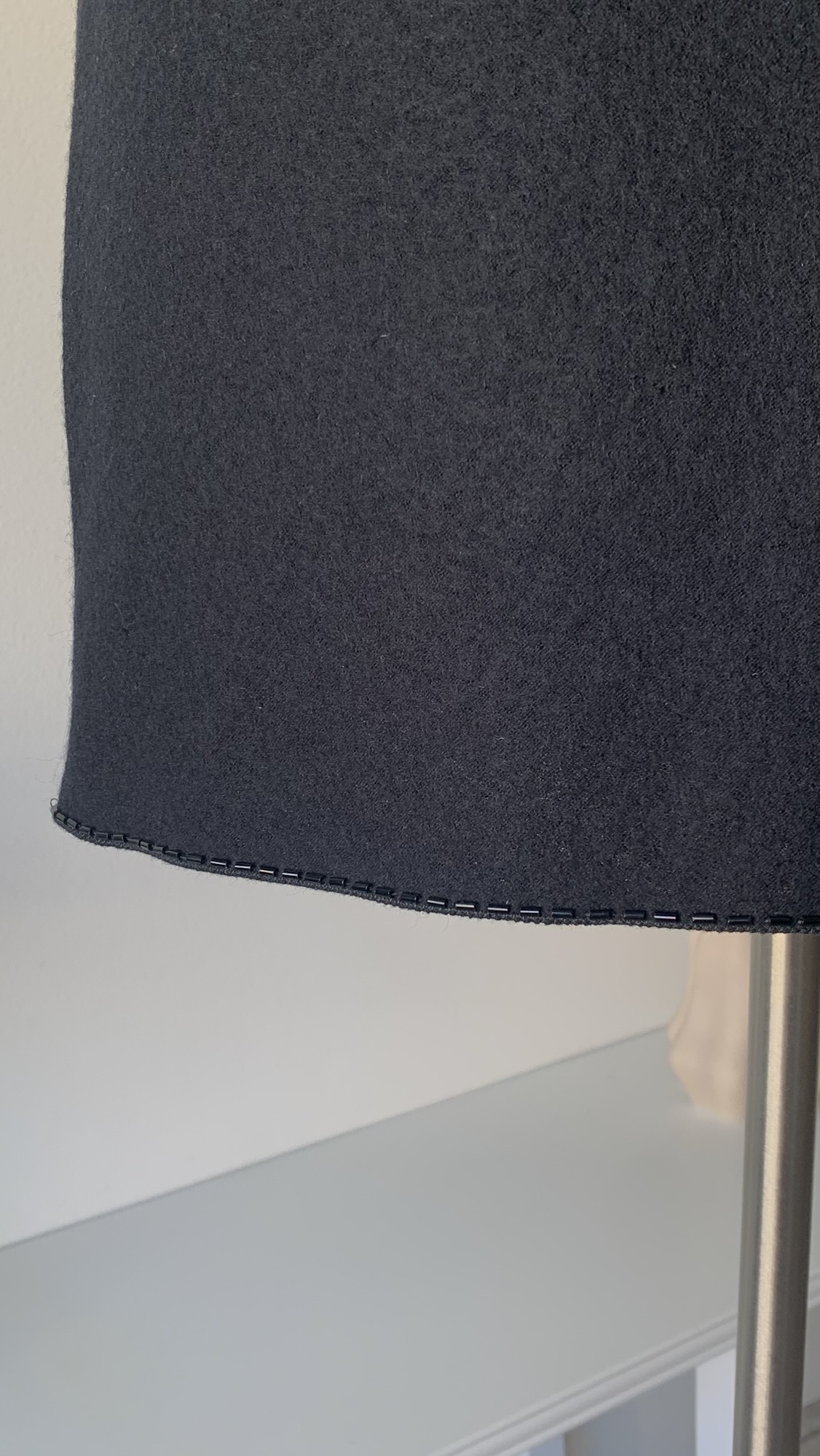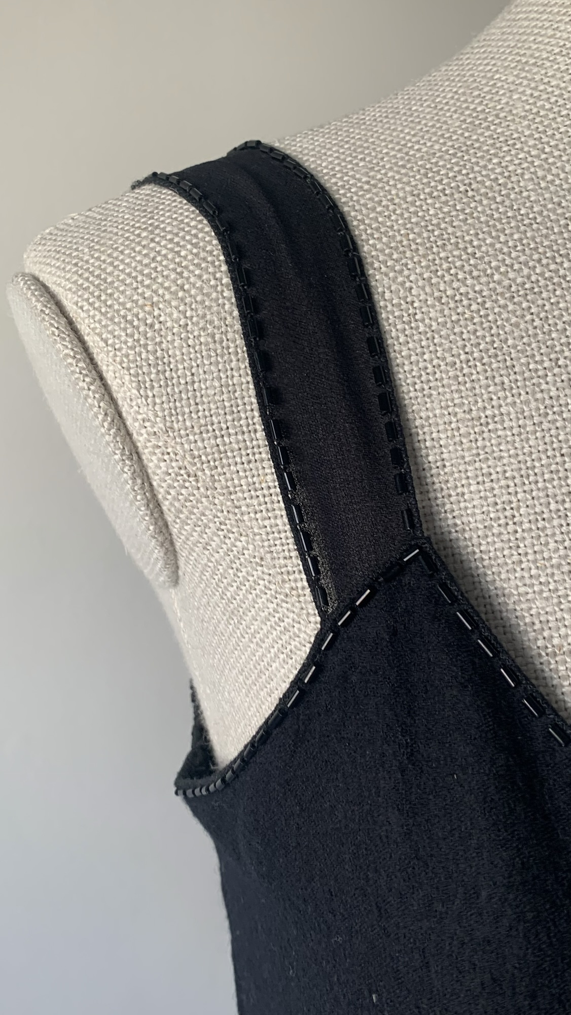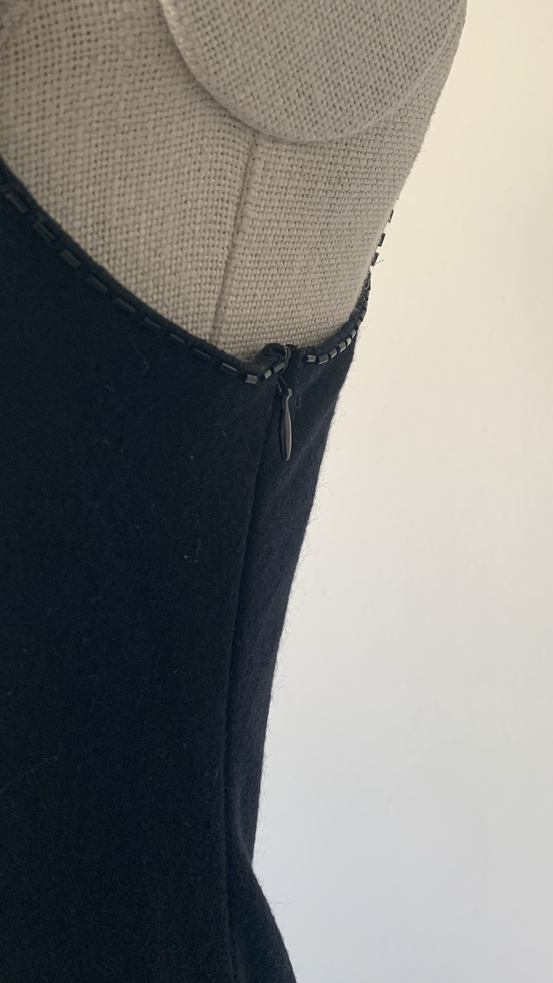 Details : This piece features a black colour wool material, silk straps with beads, a beaded trim at the hem and neckline, a lateral zipper closure and mini length.