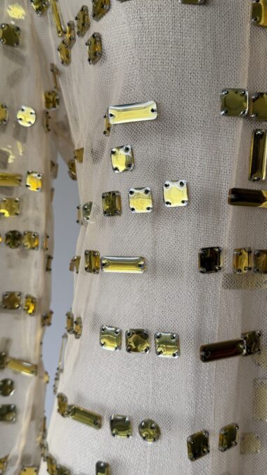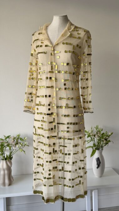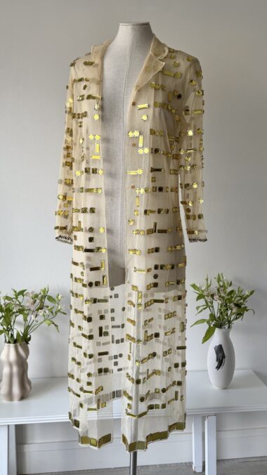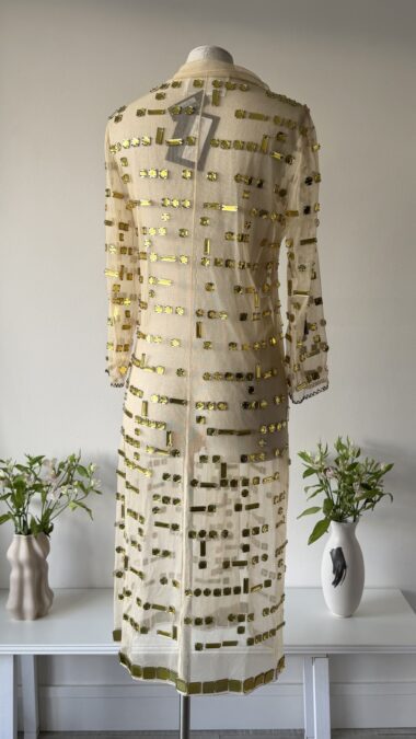 Details : This exquisite piece crafted from beige-toned tulle, covered in golden crystals in square and rectangular shapes. It is of midi length and features a fitted silhouette with long sleeves, larger golden crystals at the hem, two clasp closures and soft peak lapels. The hem at the sleeves is decorated with a zig-zap design.