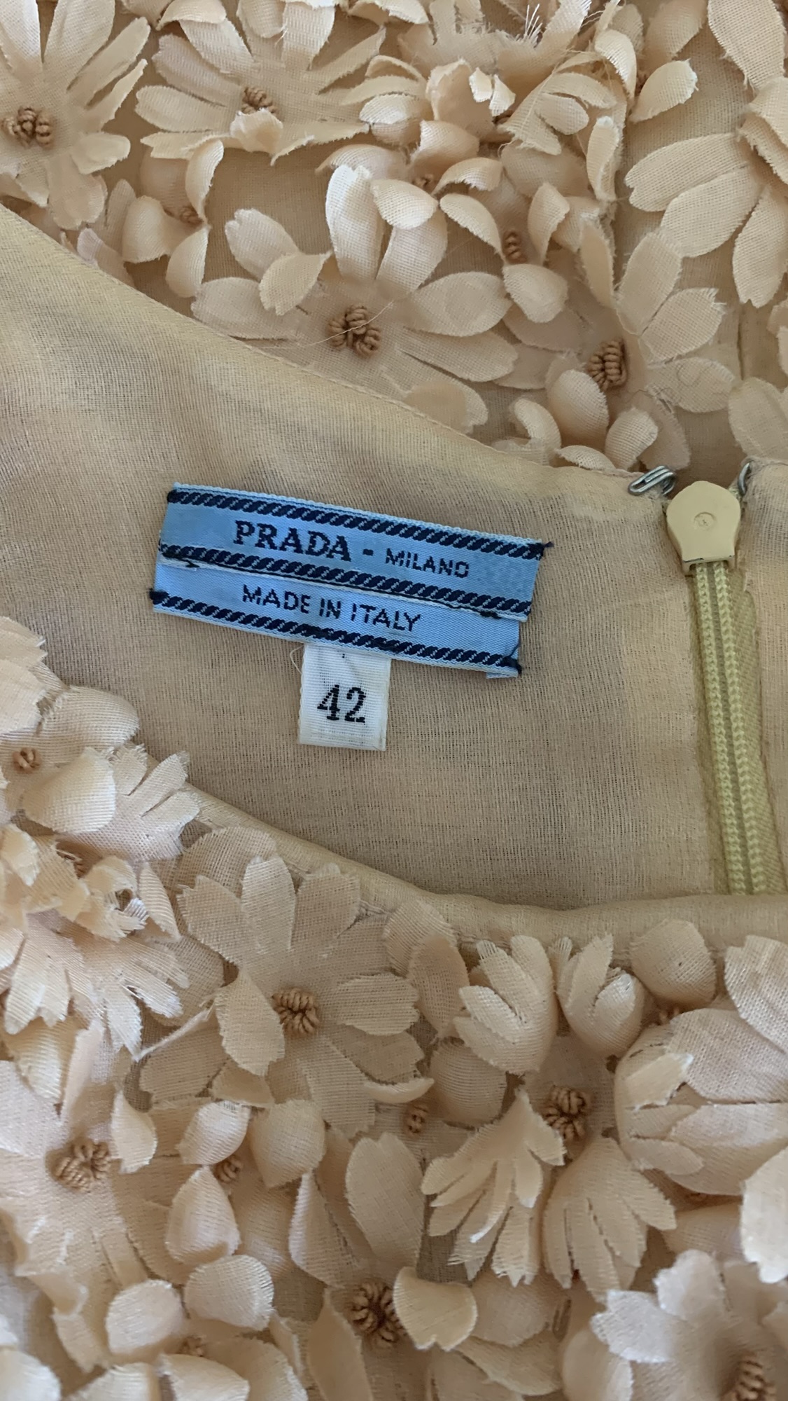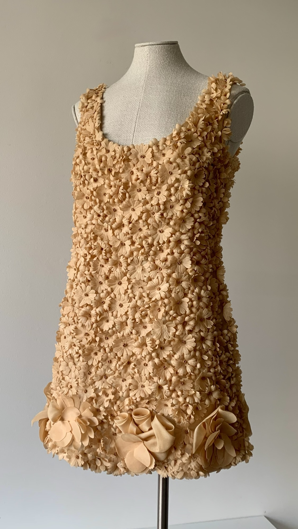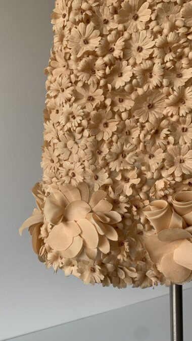 Extremely rare and museum-level Prada nude-peach floral appliqué mini dress from the Spring Summer 1992 collection. As seen on the runway and ad campaign.