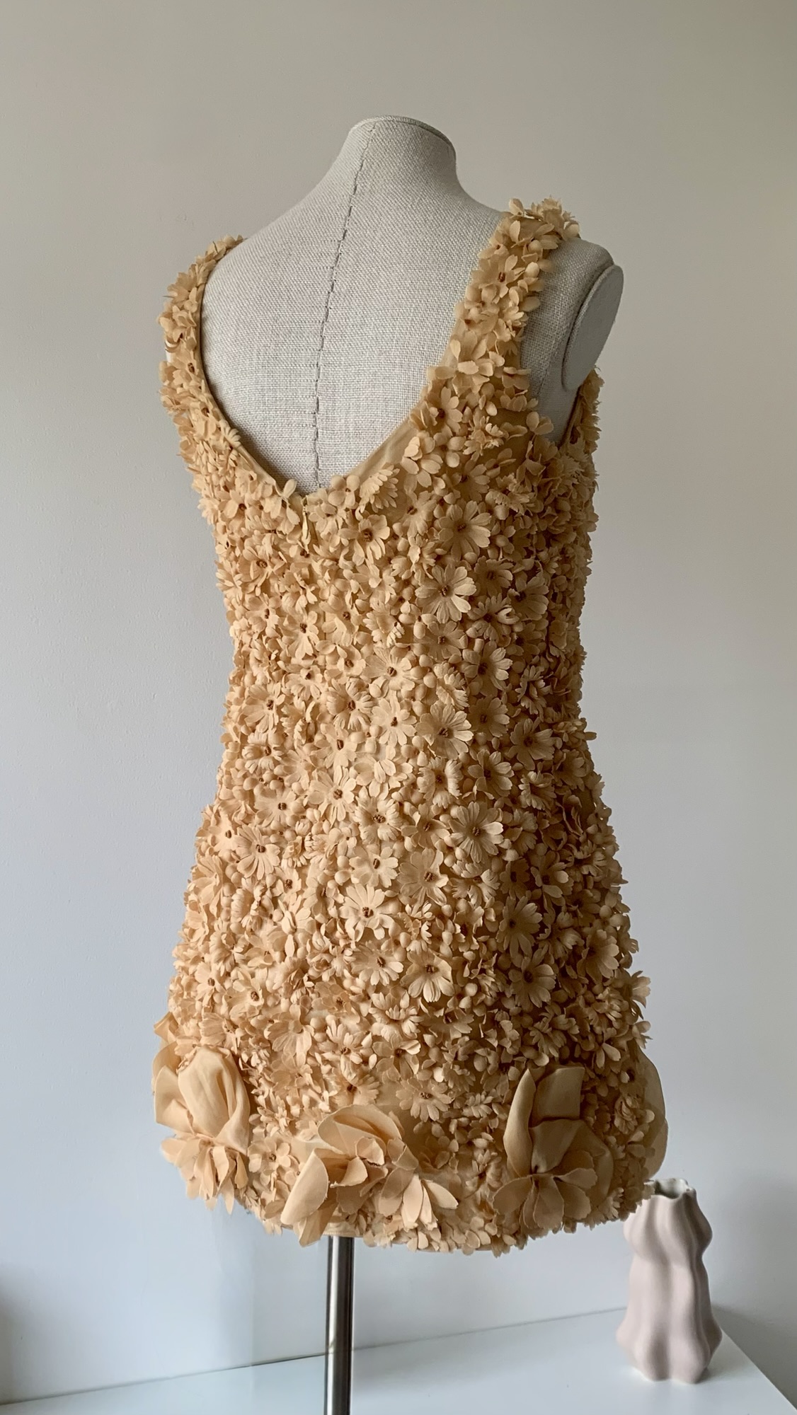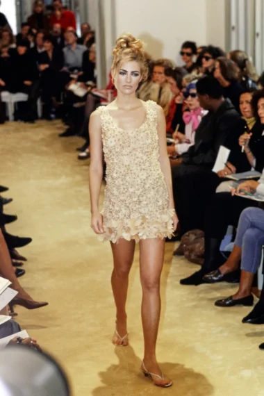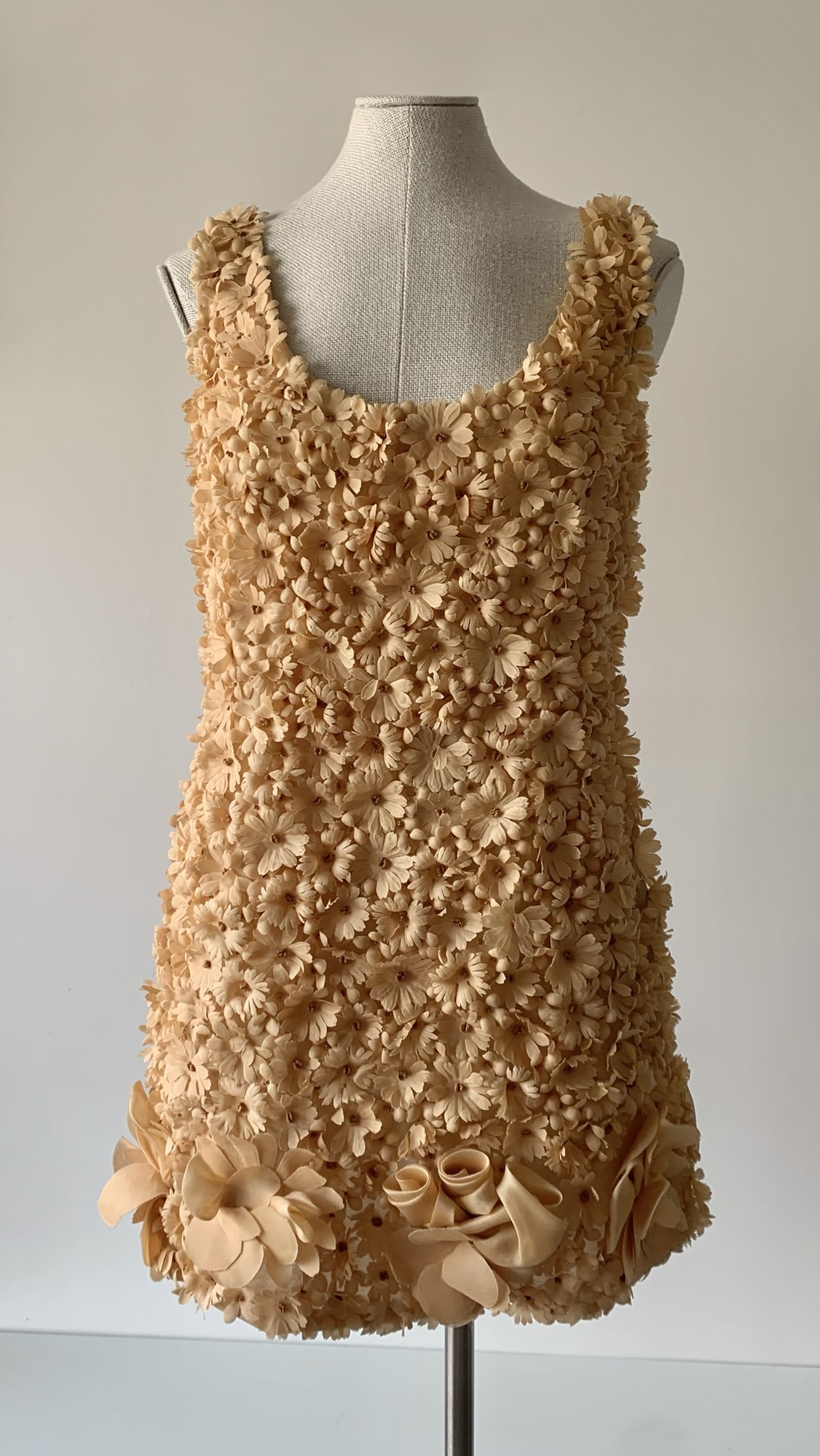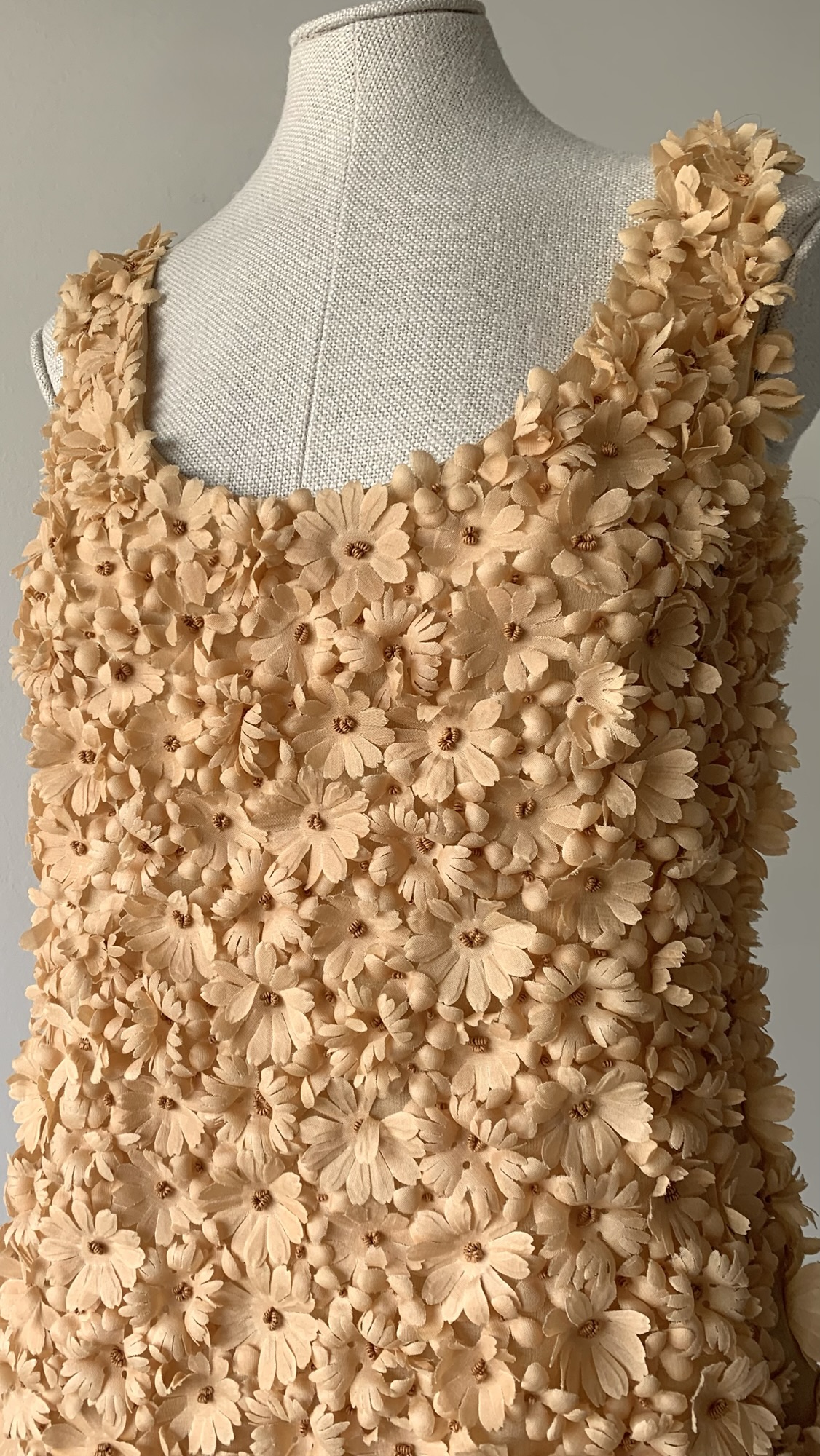 Extremely rare and museum-level Prada nude-peach floral appliqué mini dress from the Spring Summer 1992 collection. As seen on the runway and ad campaign.