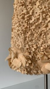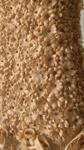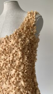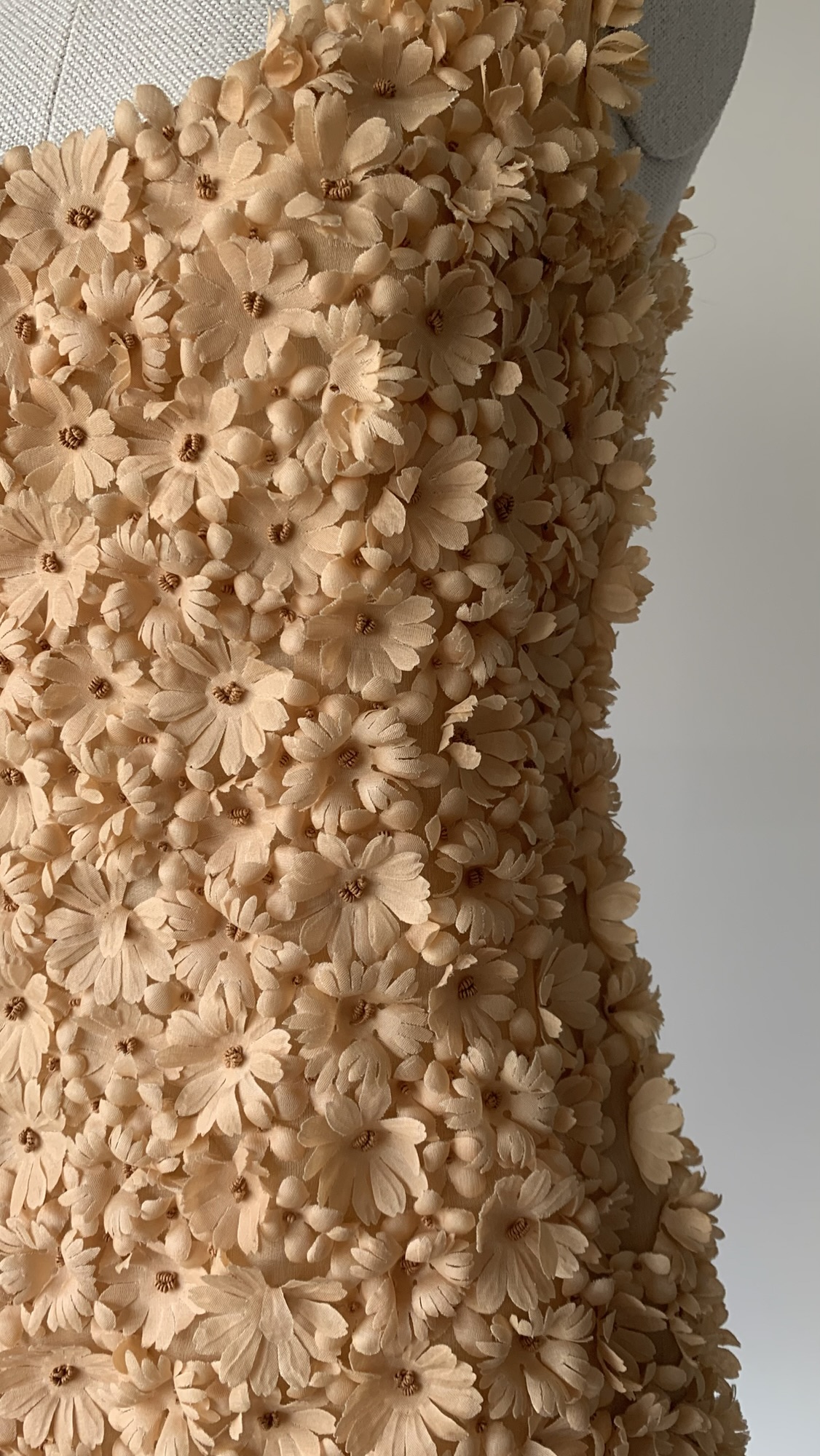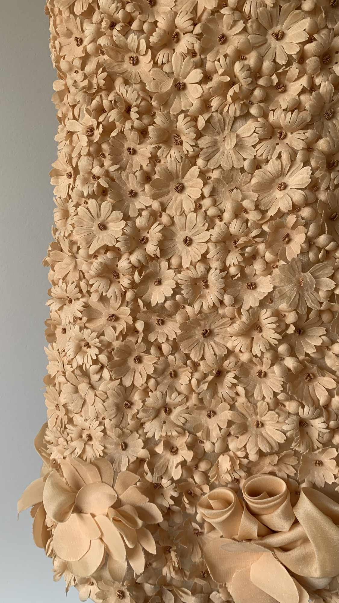 Details : A true showpiece, this dress is adorned with an abundance of hand-sewn floral appliqués creating a stunning three-dimensional texture. It is designed in a soft nude-peach hue, is sleeveless,  has a scoop-neckline and extra floral detailing at the hem that adds a sculptural, romantic finish.