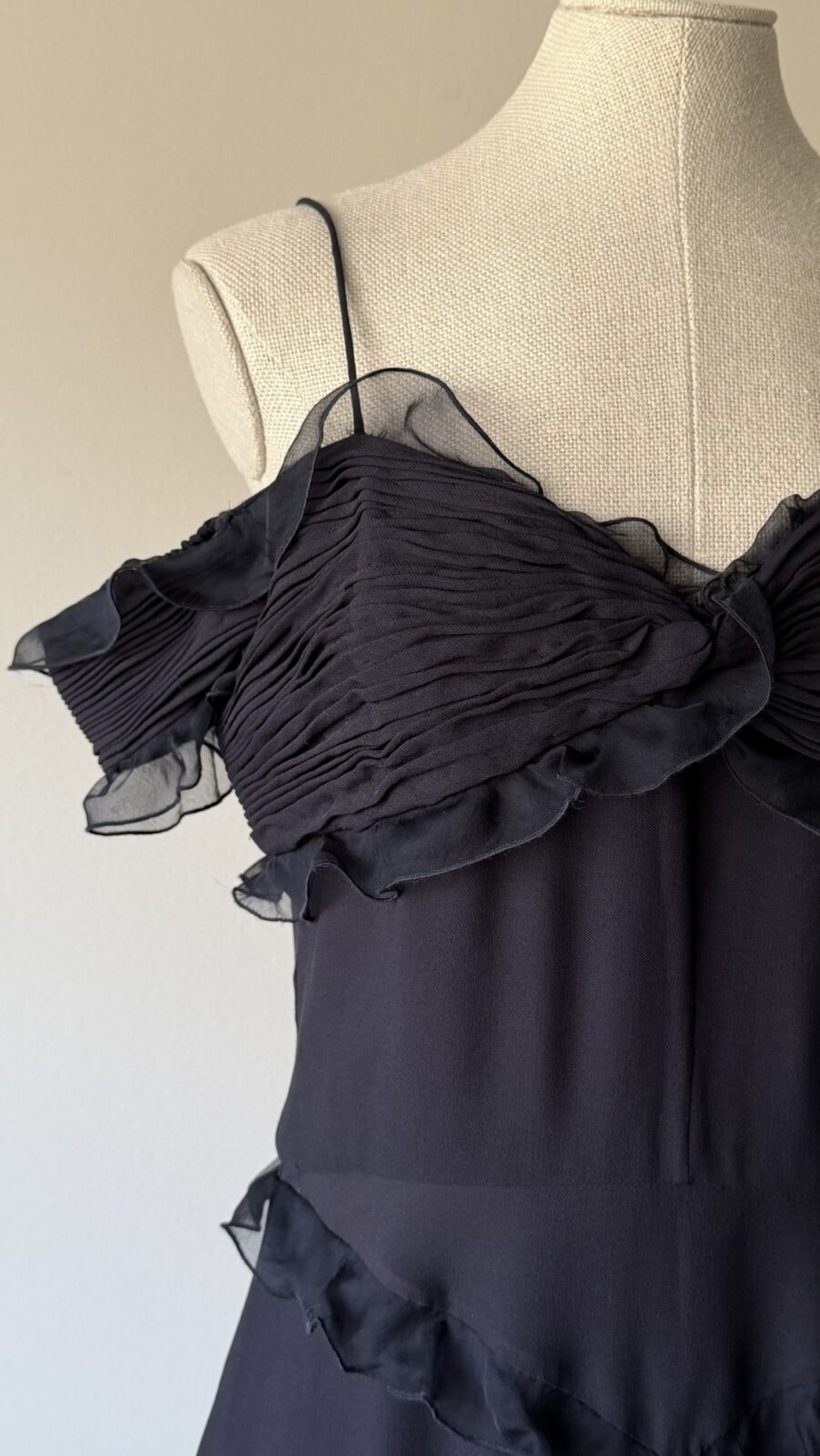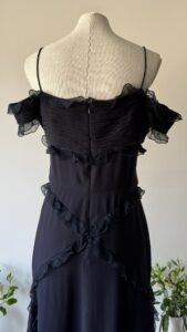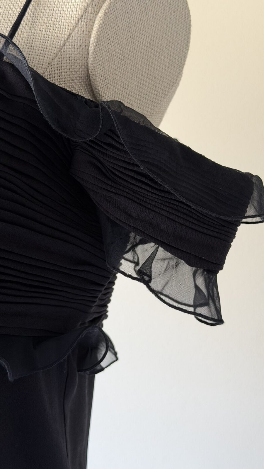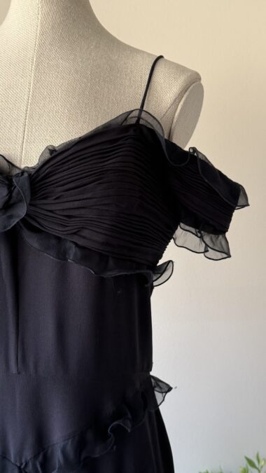 Details : This piece is made of black lightweight silk, has non adjustable spaghetti straps and a pleated bust with ruffles all around. It is fully lined, has a back zipper, and winglet off shoulder sleeves.