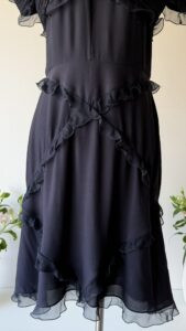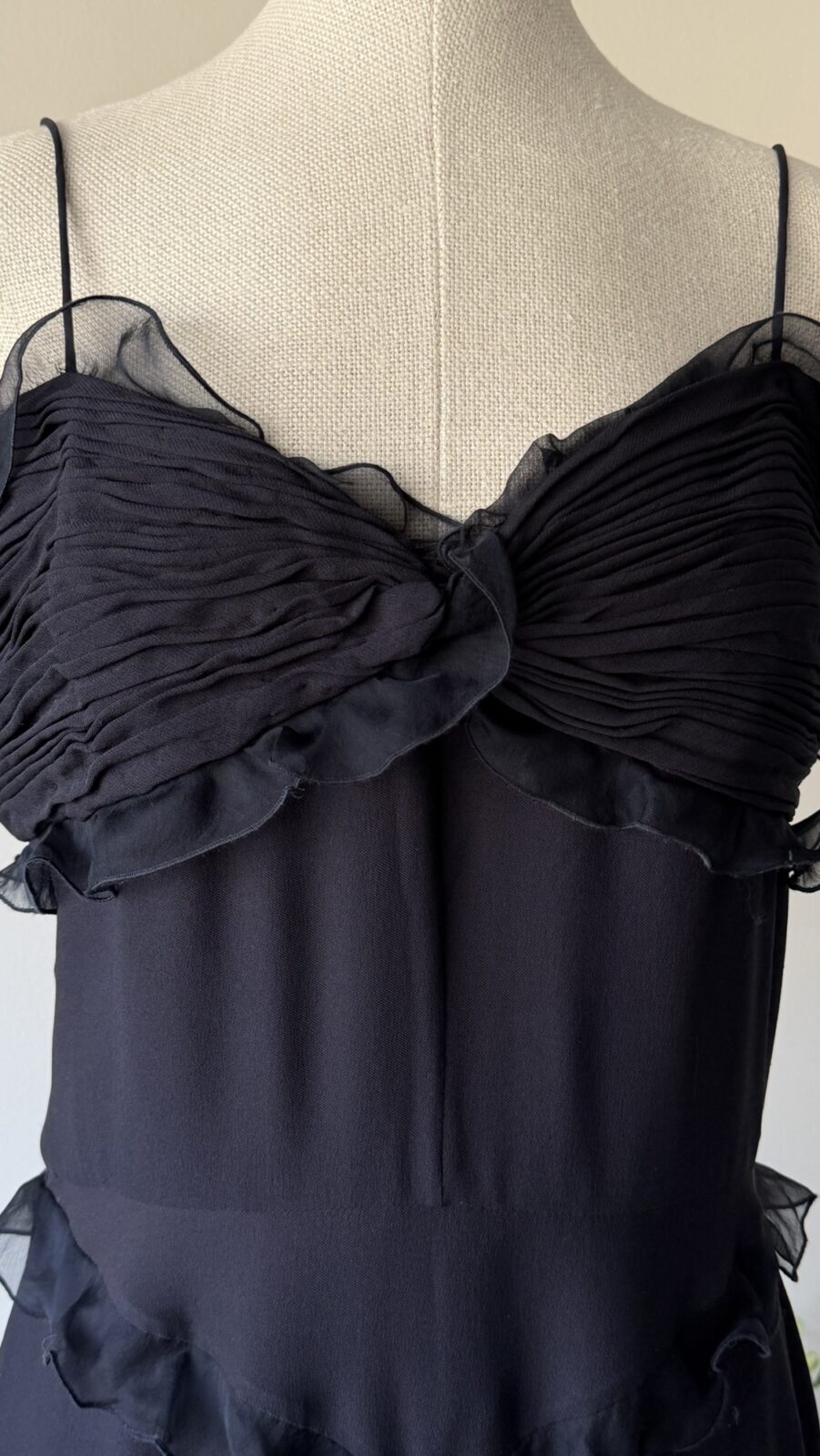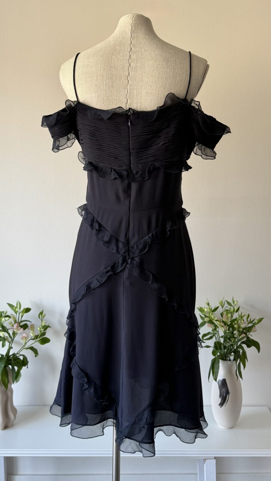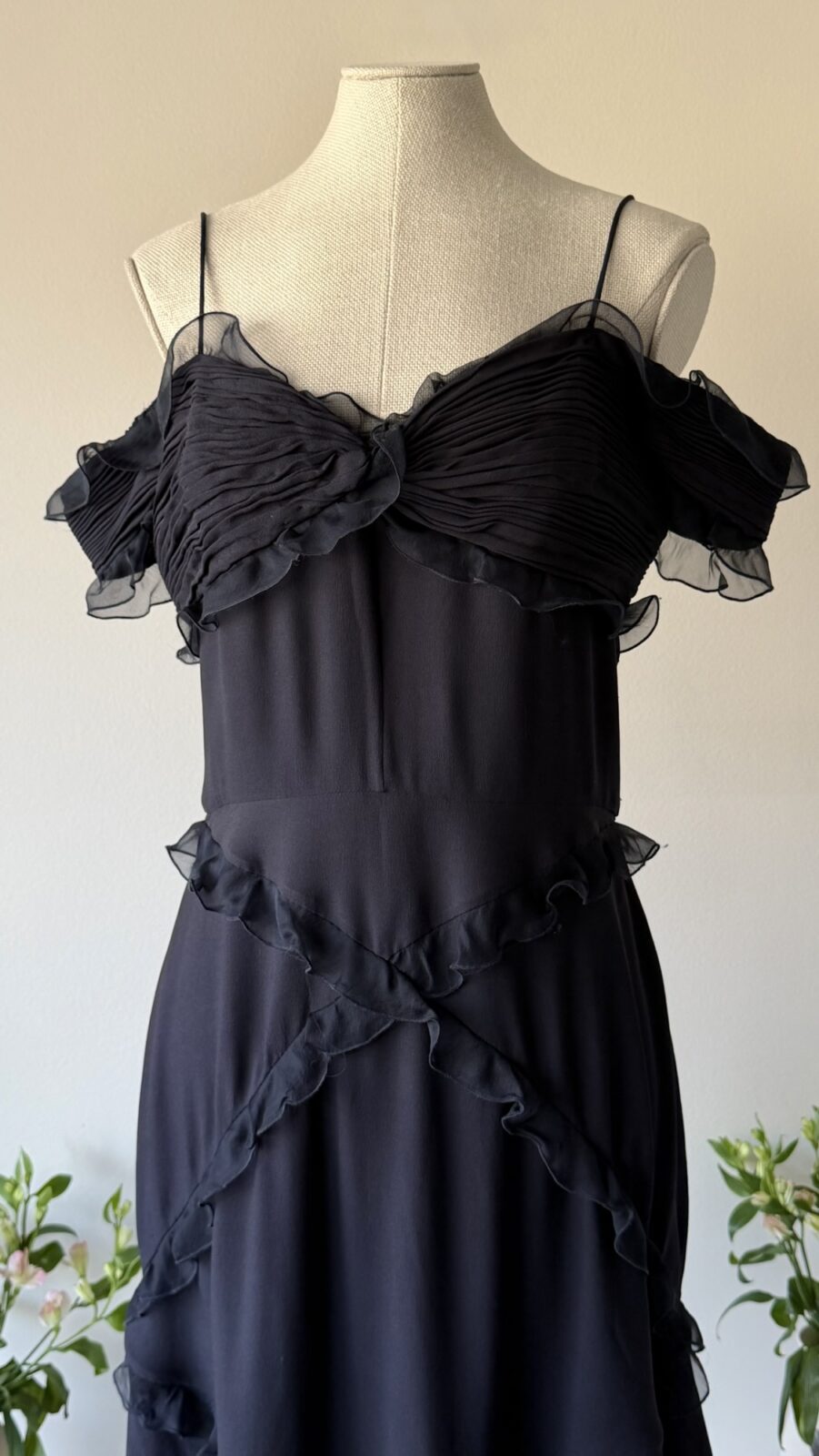 Details : This piece is made of black lightweight silk, has non adjustable spaghetti straps and a pleated bust with ruffles all around. It is fully lined, has a back zipper, and winglet off shoulder sleeves.