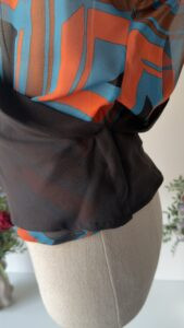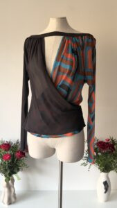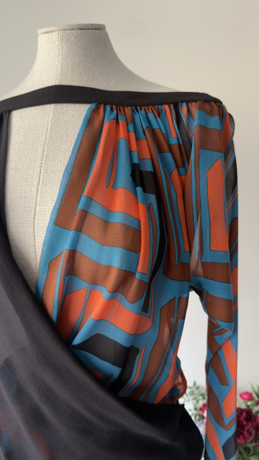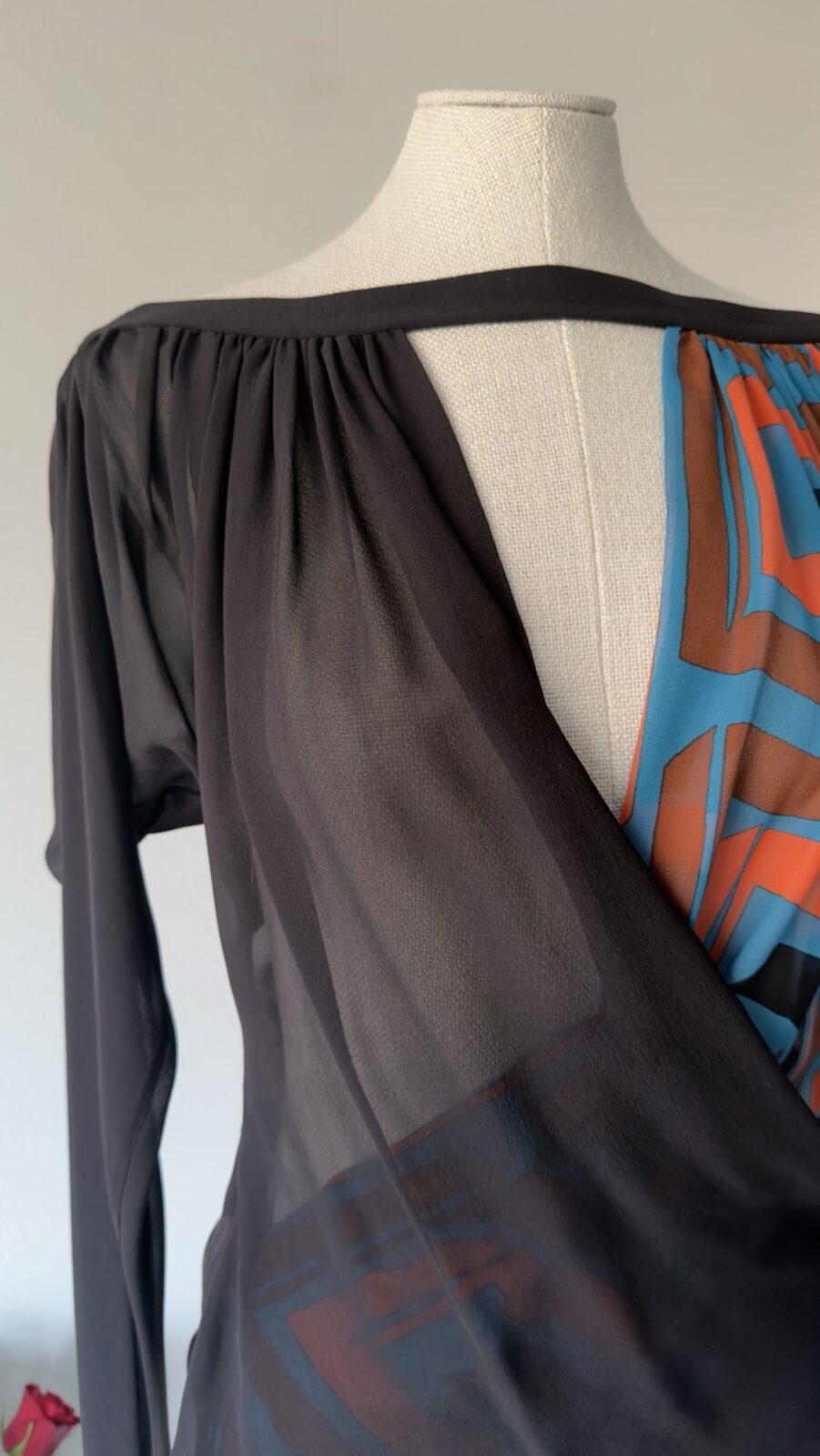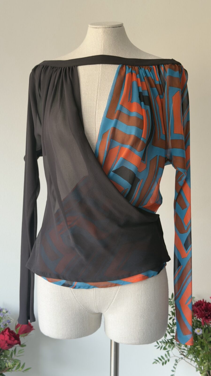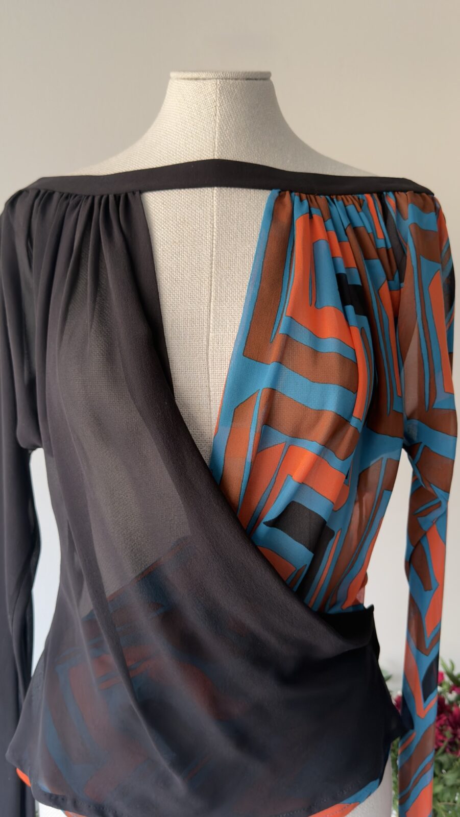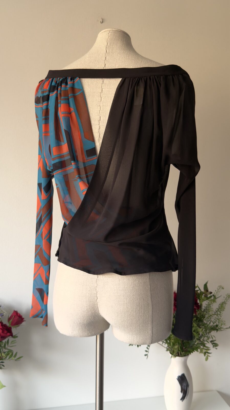 Details : This half black half orange-turquoise piece is made of lightweight silk that creates draping and a plunging V shape in the front and back, with black silk trim detail. It has a wrap design with internal clip closures on the two lower sides.
