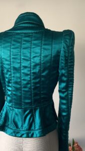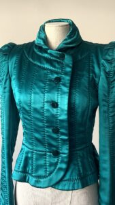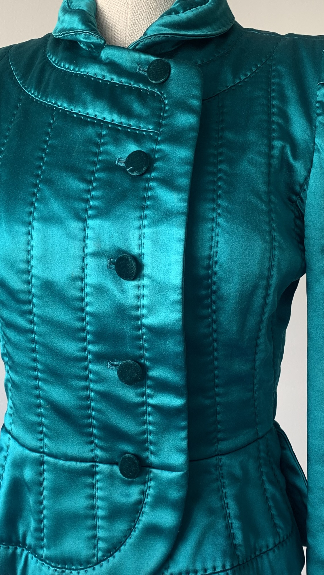 Details : This piece features a turquoise blue color with a chinoiserie design, a collared neckline, tonal stitching, a peplum-like silhouette with frontal button closures, puffed structured shoulders, and is fully lined.